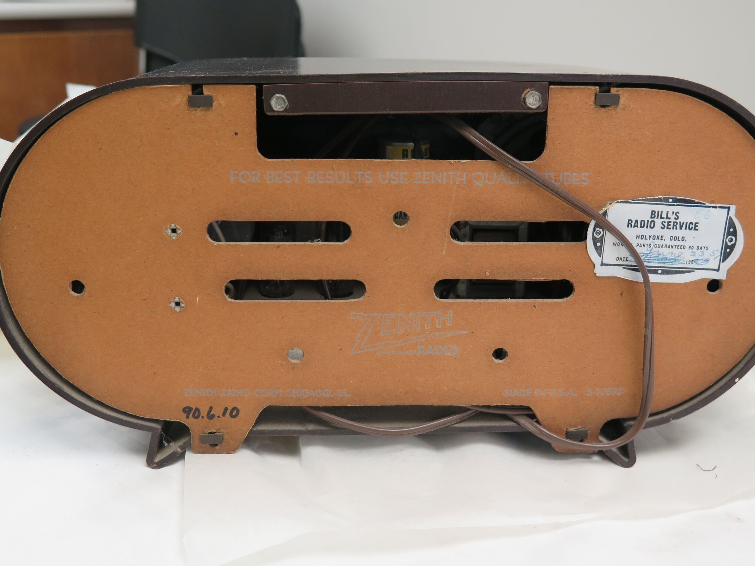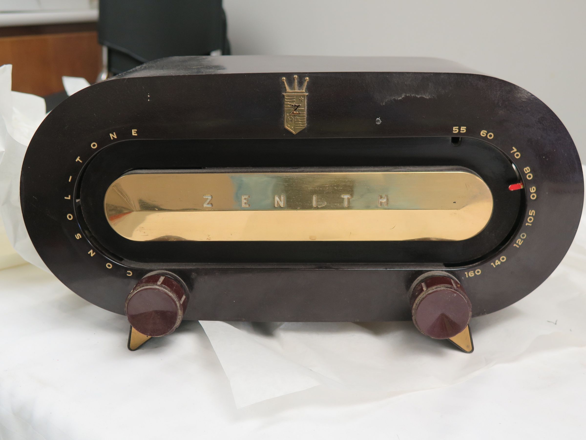 This is a Zenith brand brown Bakelite radio. The radio measures 5.5" (h) x 9" (w) x 5.5" (d).