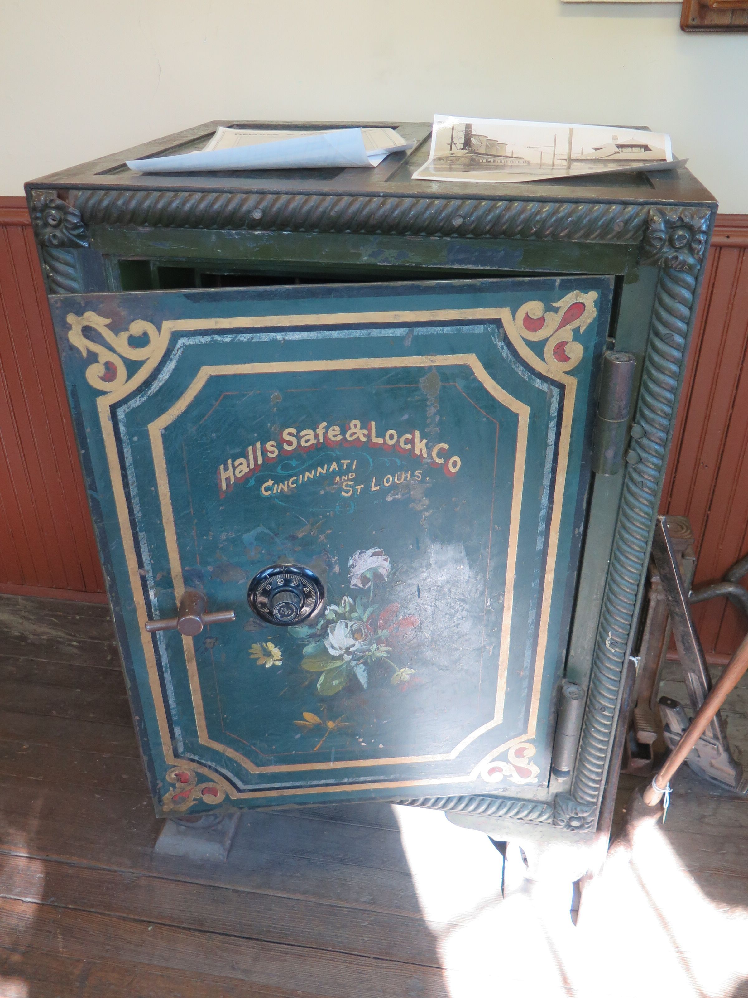 This is a green metal safe from the Depot agent's room. The safe has text on the front that reads, "Halls Safe & Lock Co./ Cincinnati/ and/ St. Louis". The safe measures 44" (h) x 30" (w) x 26" (d).