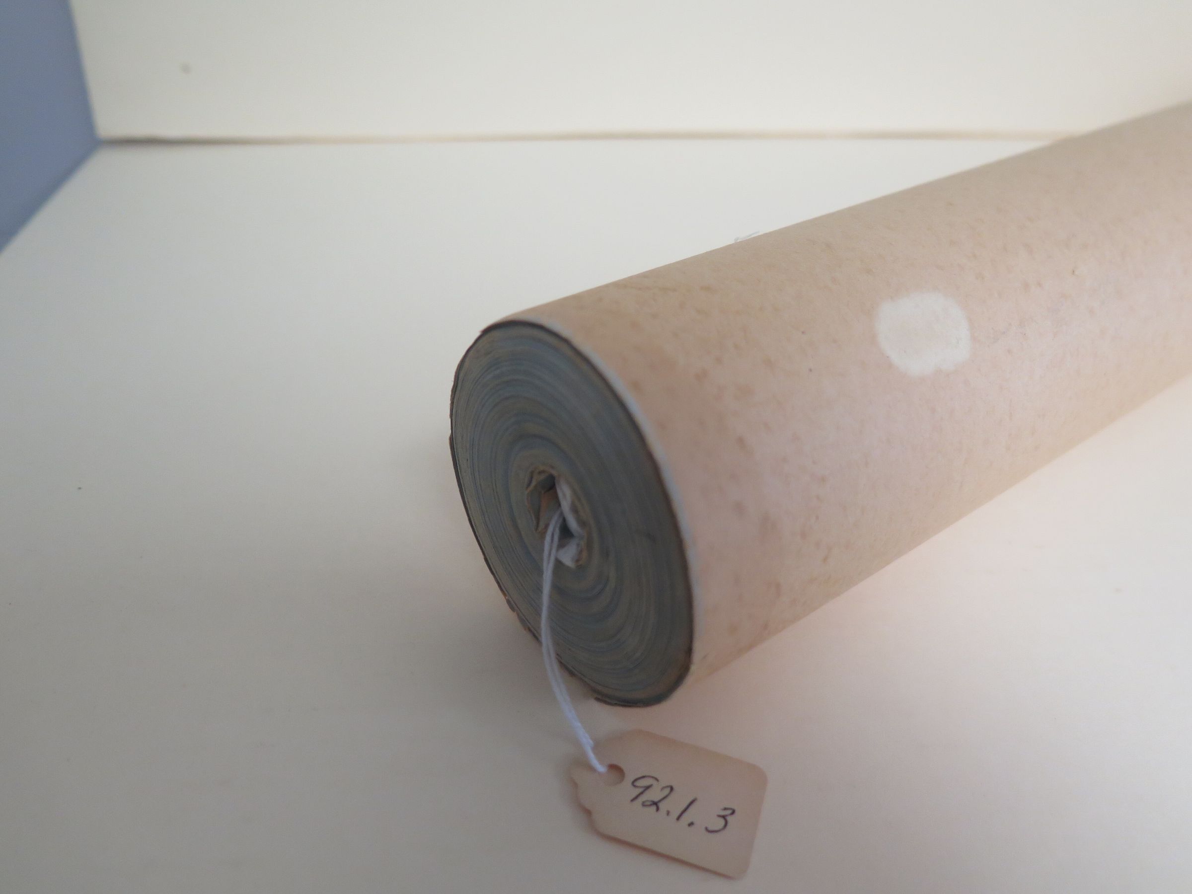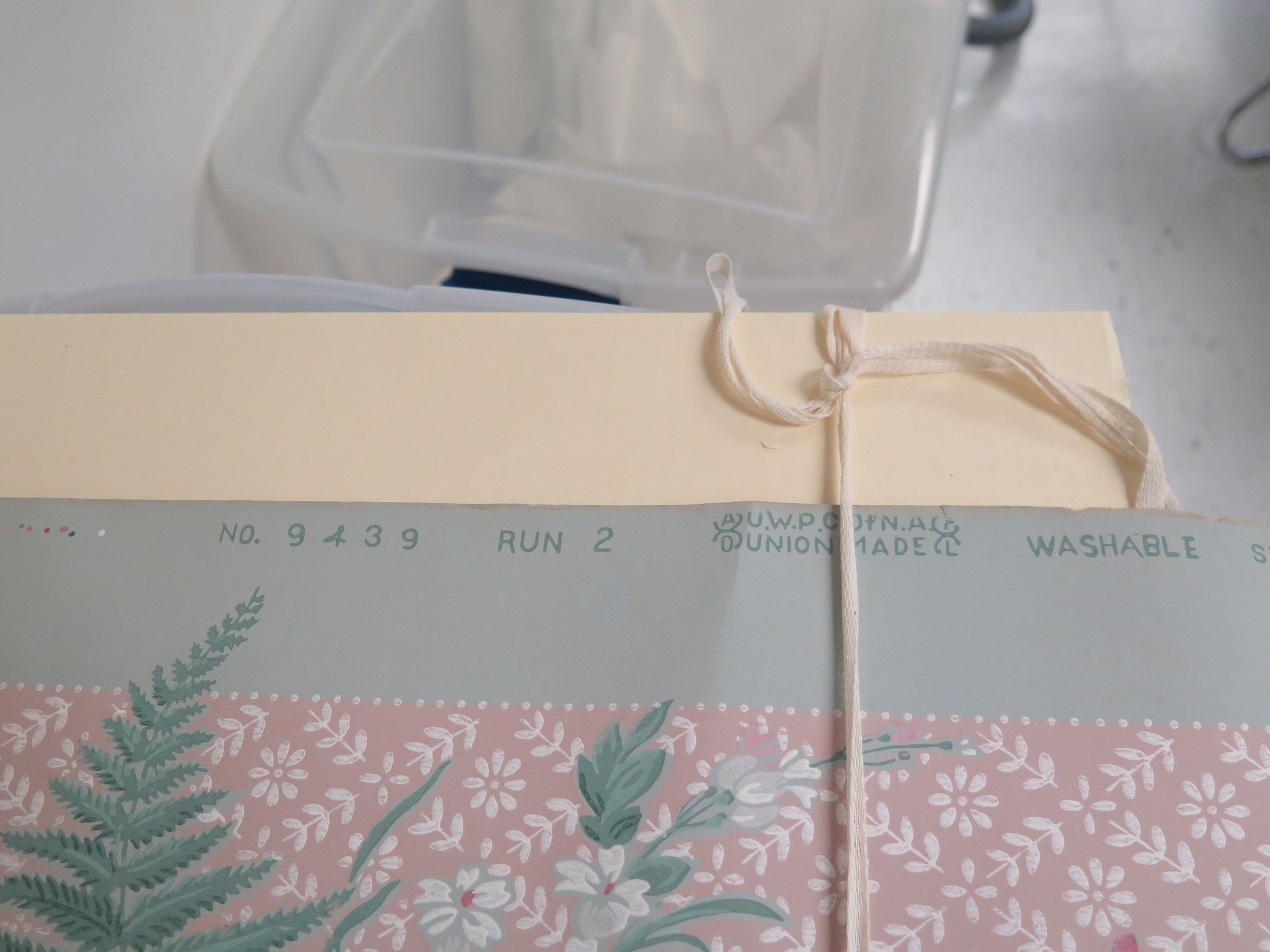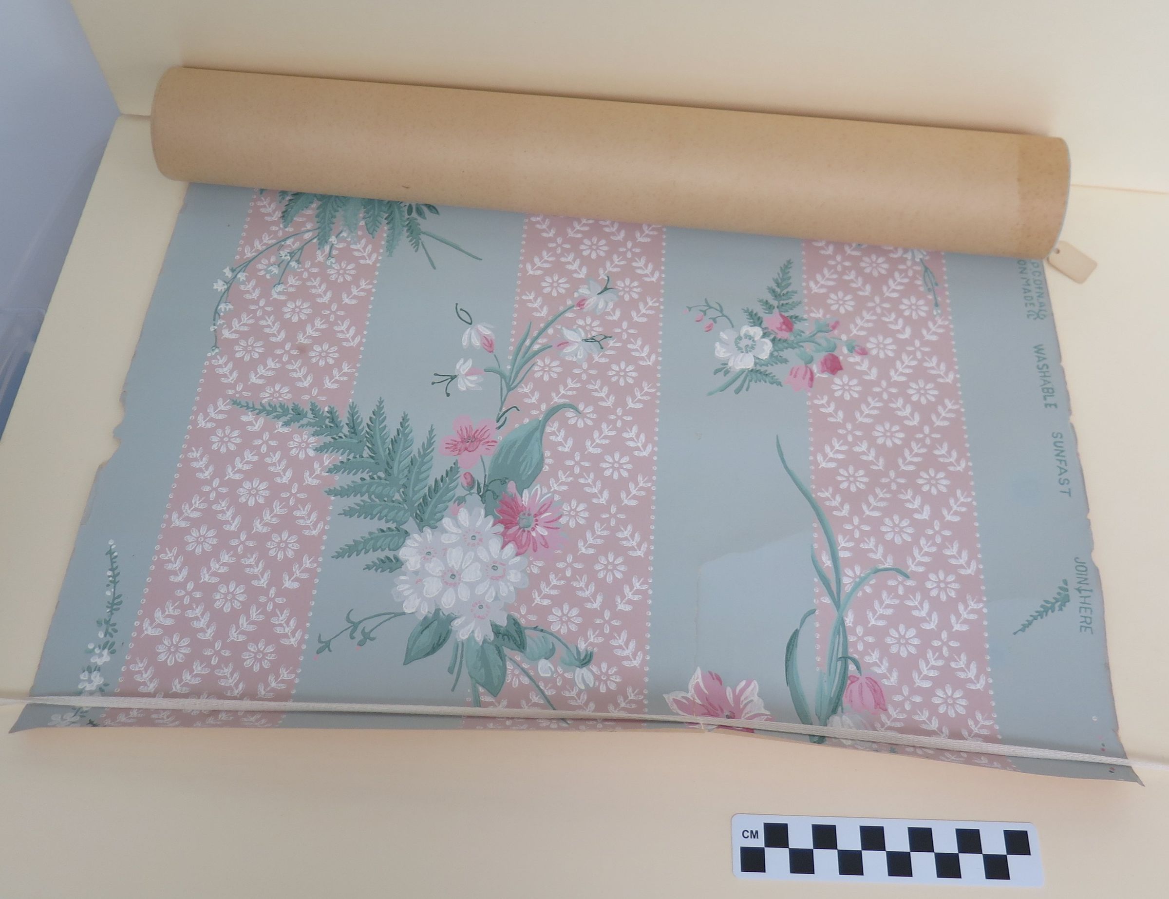 This is a roll wallpaper. The wallpaper is soft green with pink and white stripes and a floral pattern. The text along the edge of the wallpaper reads, "No. 9439 Run 2 U.W.P.O of N.A. Union Made Washable". The wallpaper measures 2.25" (d) x 18.5" (l).