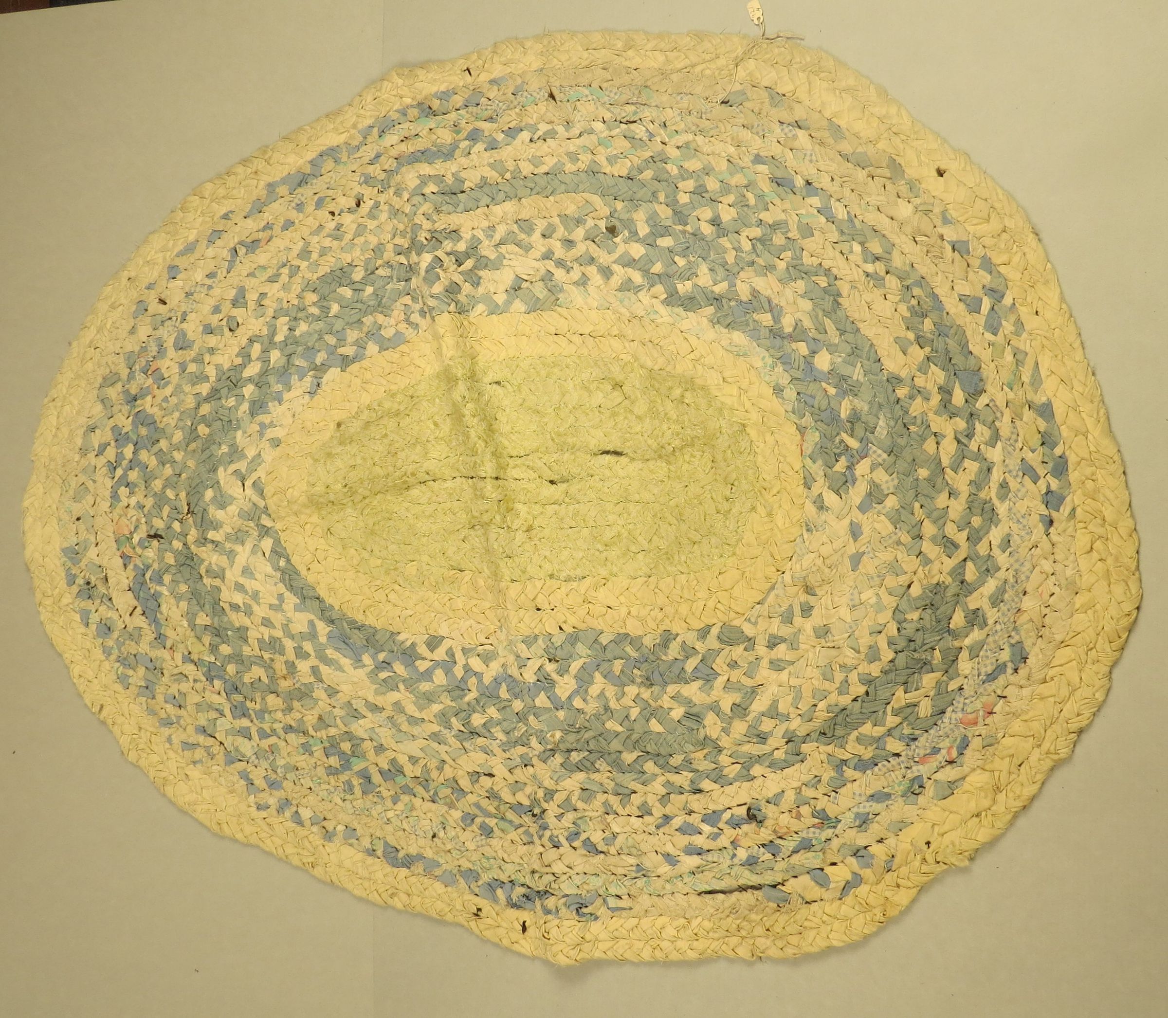 This is a handmade, blue and white round braided rug. Rug measures 17" (w) x 28" (l) when folded.