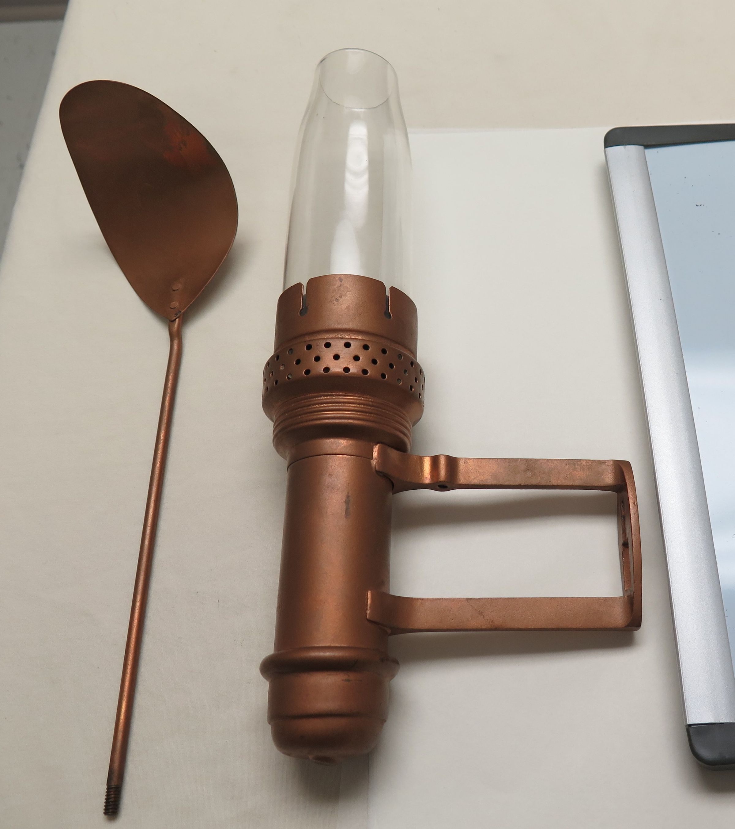This is a bronze railroad side lamp candle with a clear glass chimney. The lamp measures 10" (h) x 2" (w).