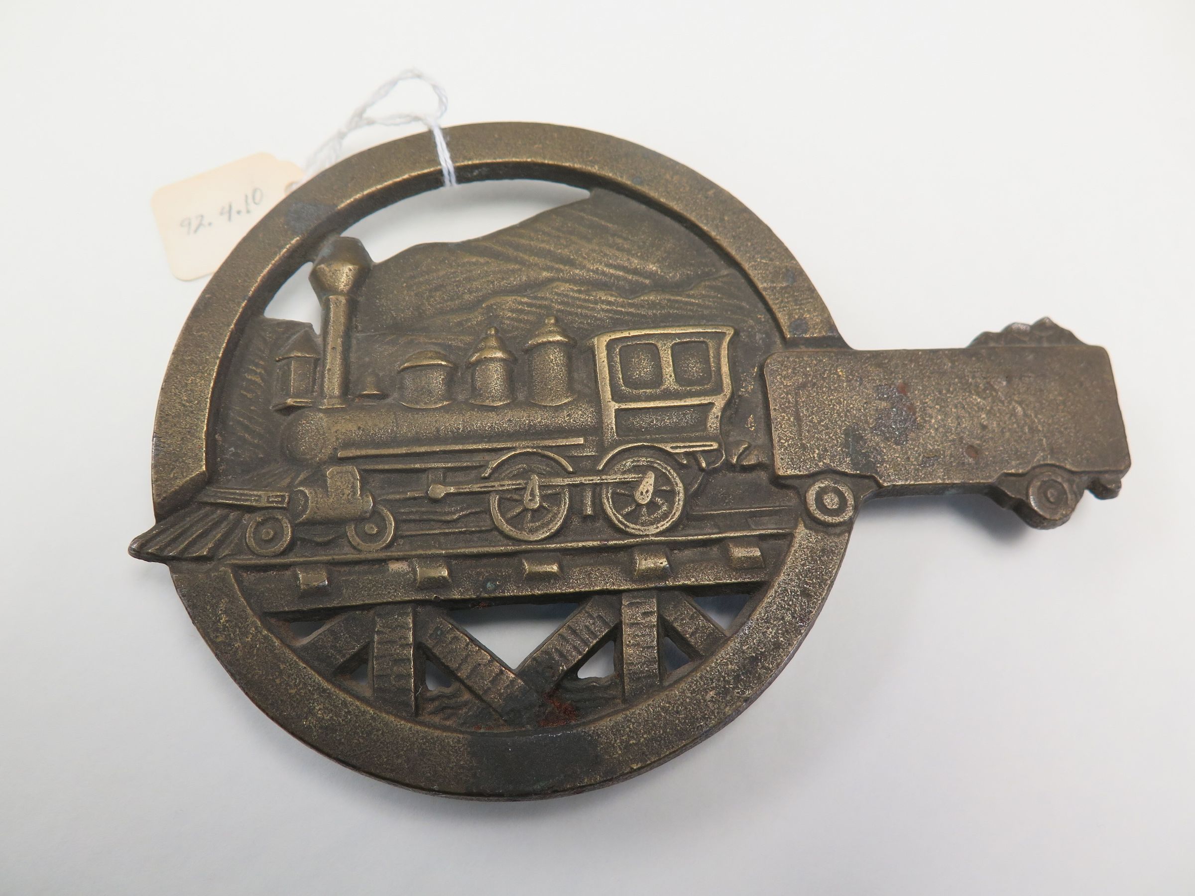 This is a metal trivet with the image of a train inside of a circle. The train sticks out past the edges of the circle on the sides. The trivet measures 0.5" (h) x 6.5" (dia).