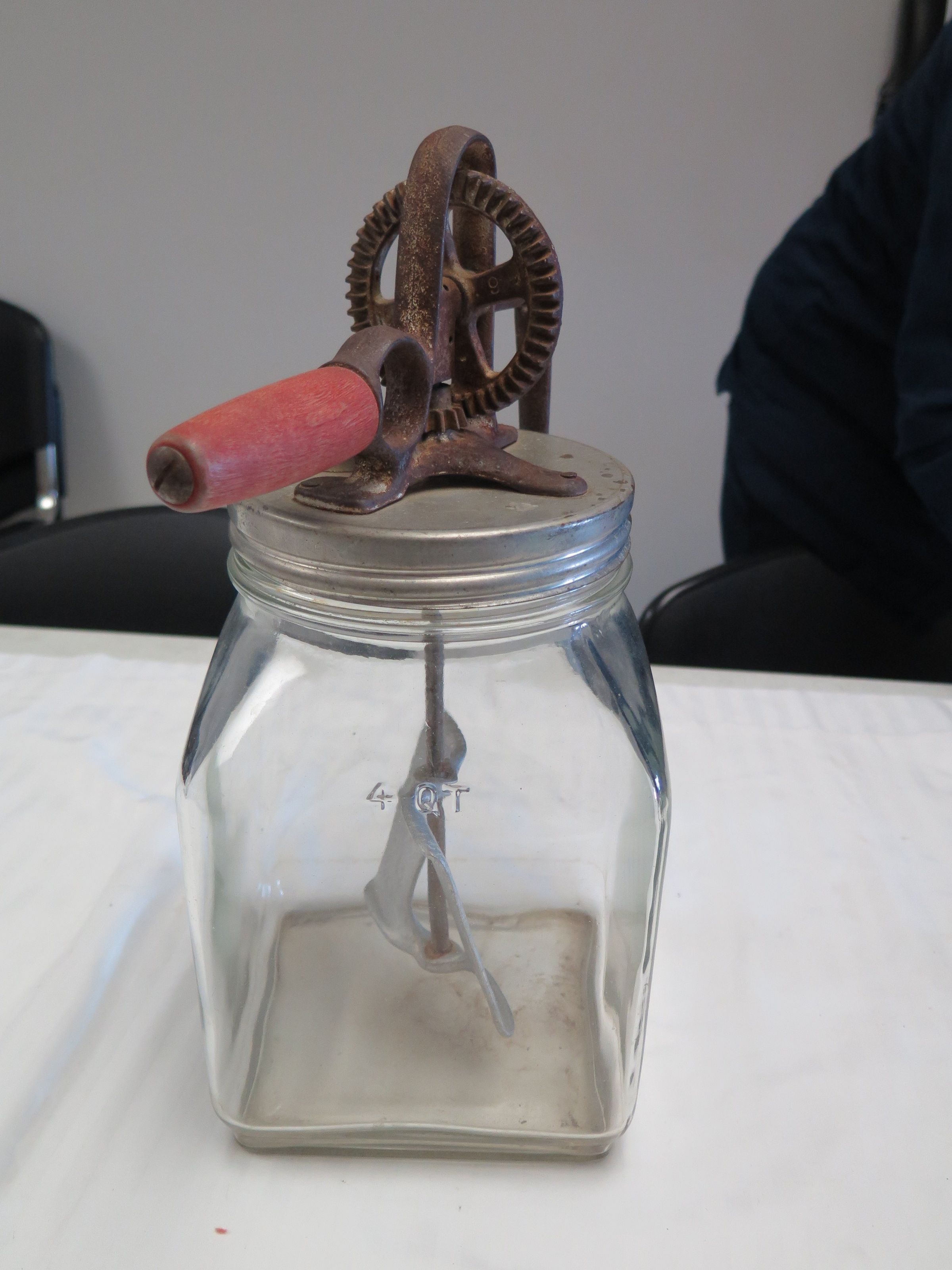 This is a clear jar churn made up of a jar with a square base and a round top and a metal mechanism with a red wood handle. The churn measures 14" (h) x 11" (w) x 6" (l).