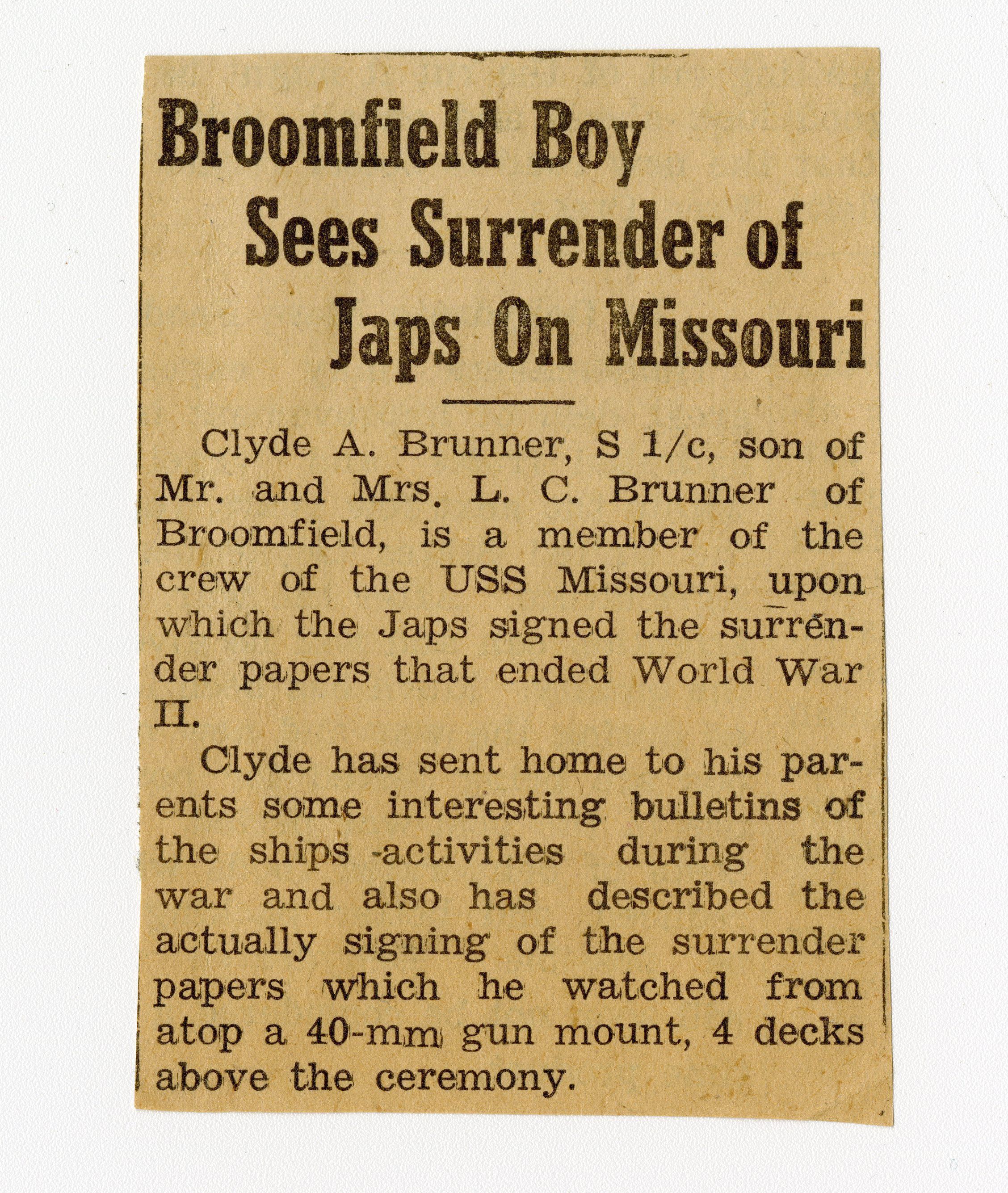 "Broomfield Boy Sees Surrender of Japs On Missouri"