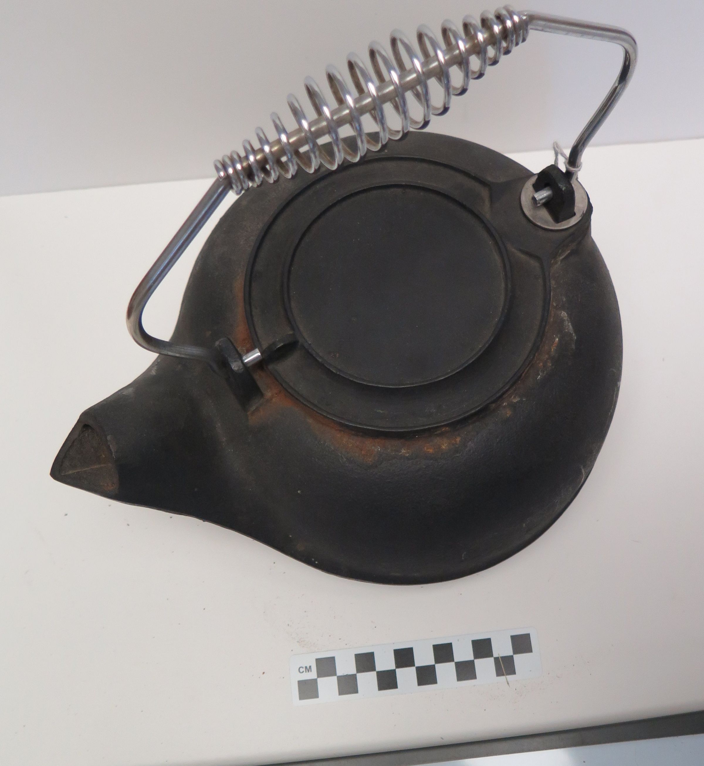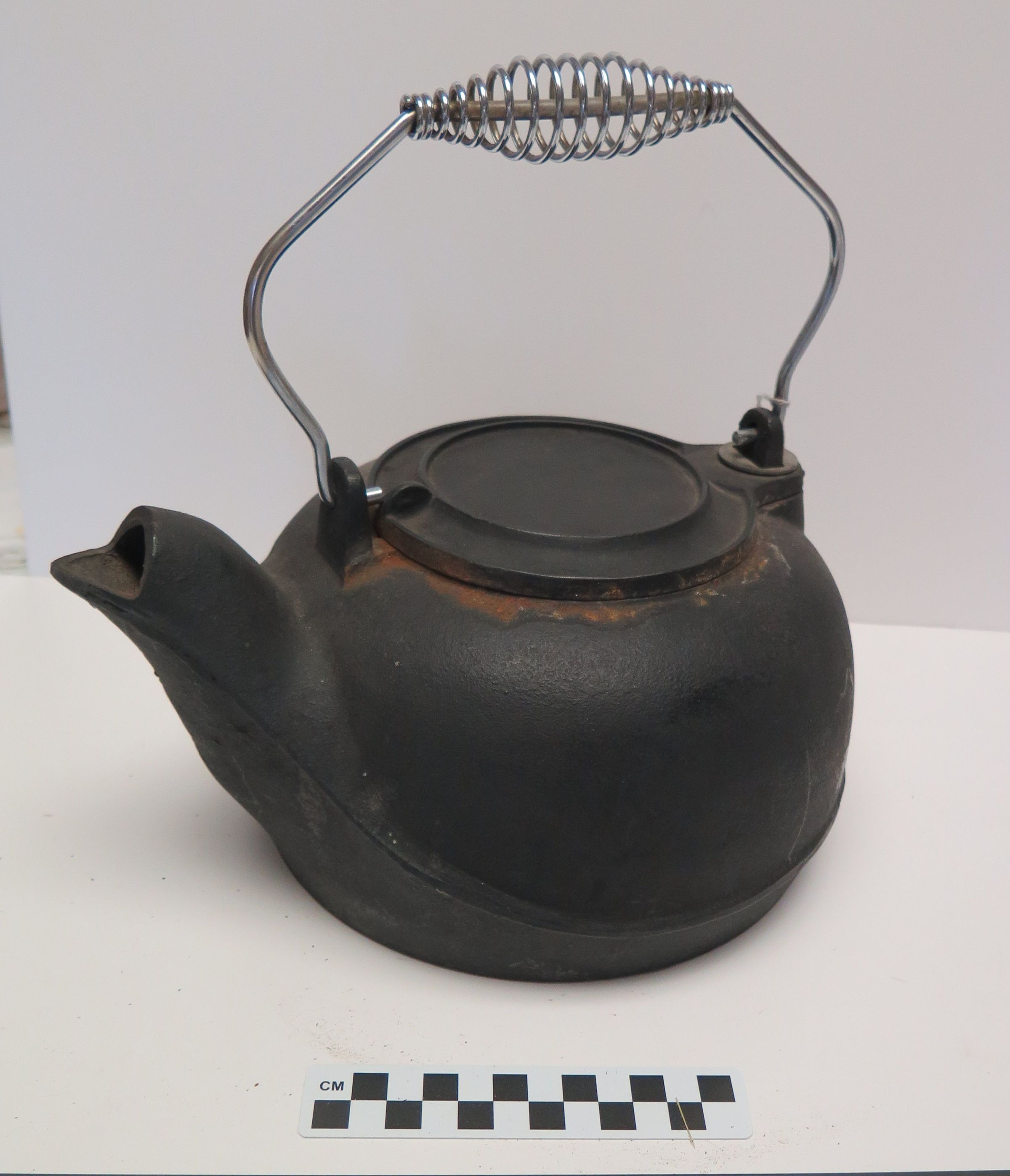 This is a cast iron tea kettle with a chrome wire handle. It has "TAIWAN" cast onto the bottom. 10"(H) x 10.5"(W) x 9"(Dia)