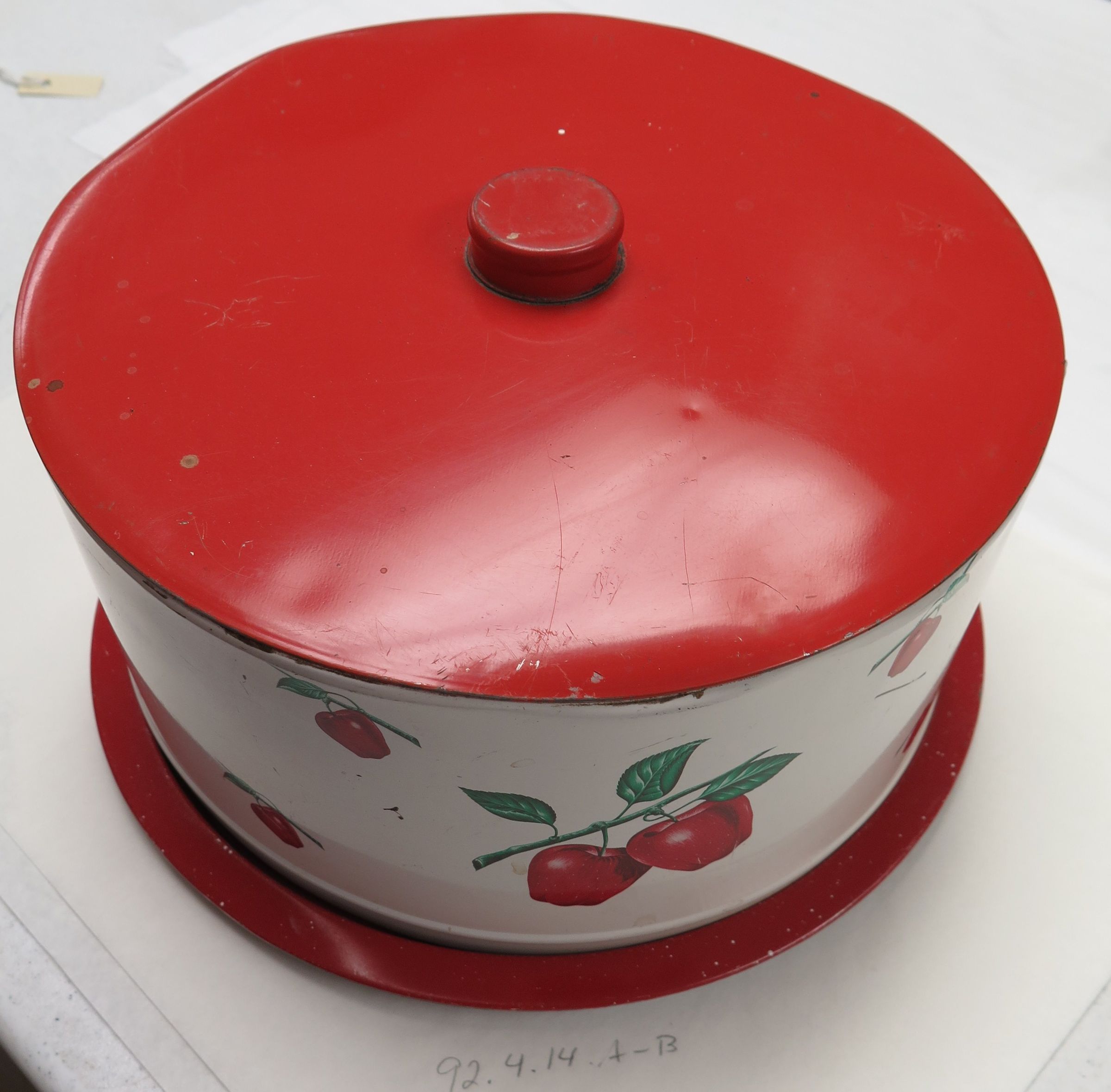 This metal cake carrier measures 6"(H) x 11.75"(Dia.). It has two parts: cover (a), bottom (b). The cover is red with a knob handle. The body is white with images of cherries. The base is red.