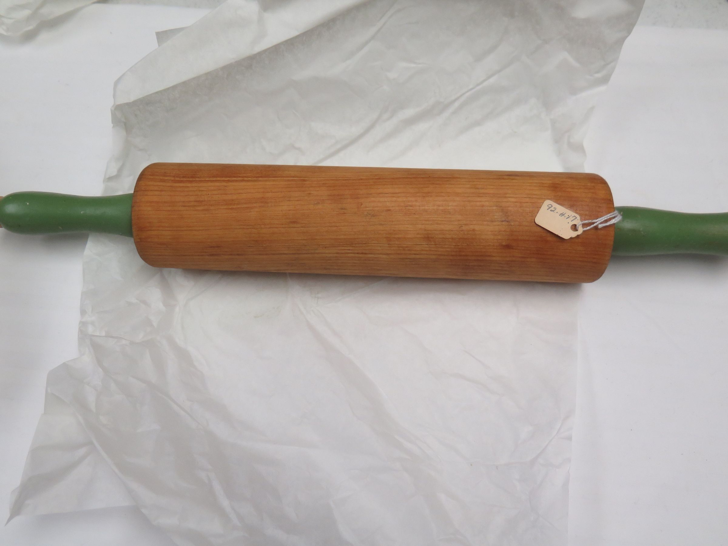 This is a wood rolling pin with green handles. The rolling pin measures 18" (l) x 2.5" (dia).