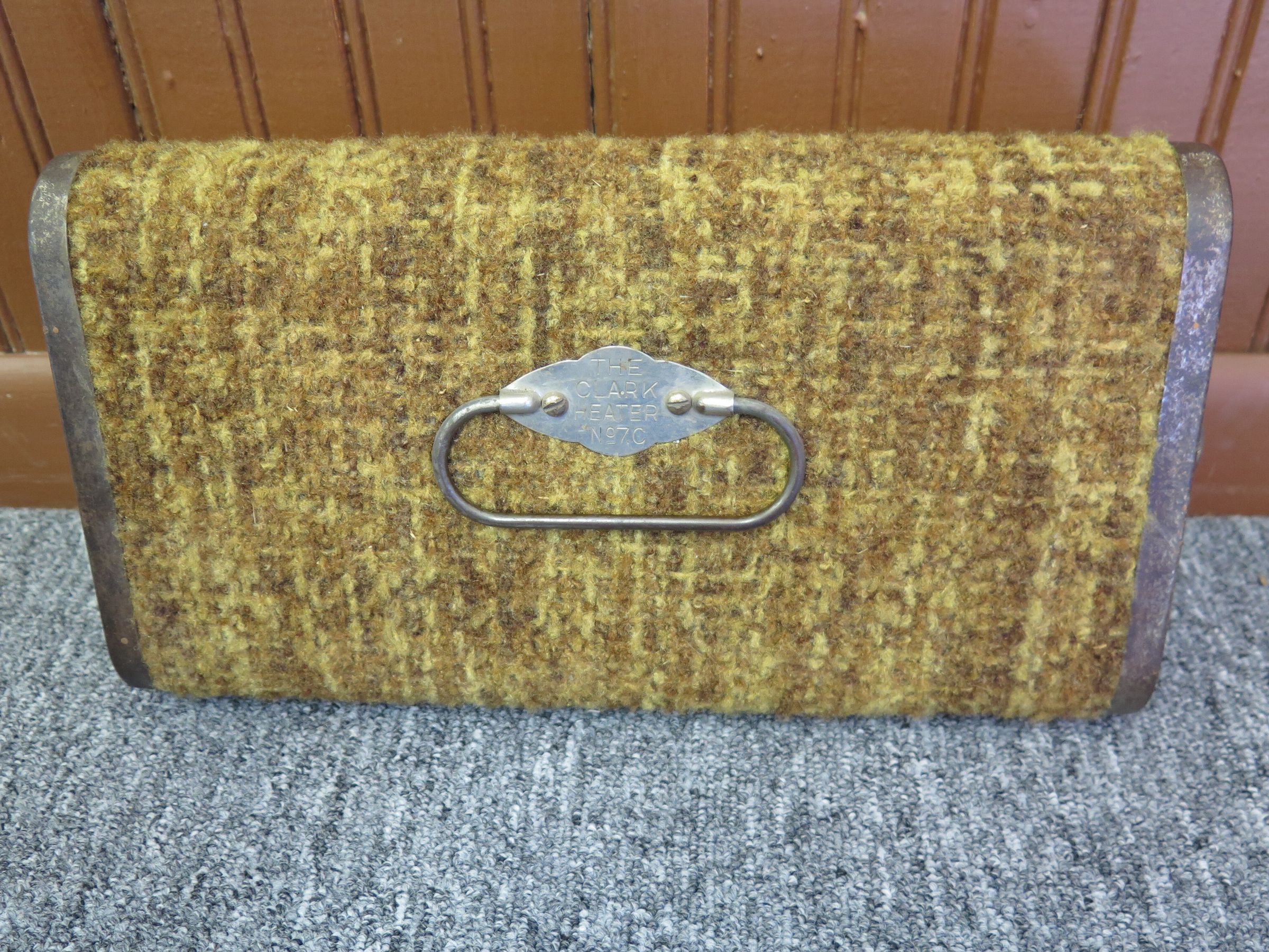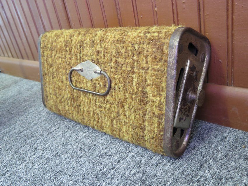 A small portable coal heater used to warm the feet of passengers during cold carriage or early car rides. Mustard yellow and brown carpeting cover the triangular shaped body. The ends of the heater are nickel-plated. One end and the back have adjustable ventilators that can be used to regulate the amount of heat. The other end has a handle for a tray that is inserted into the case to hold the heat source, which was often a brick of carbon or some coal.