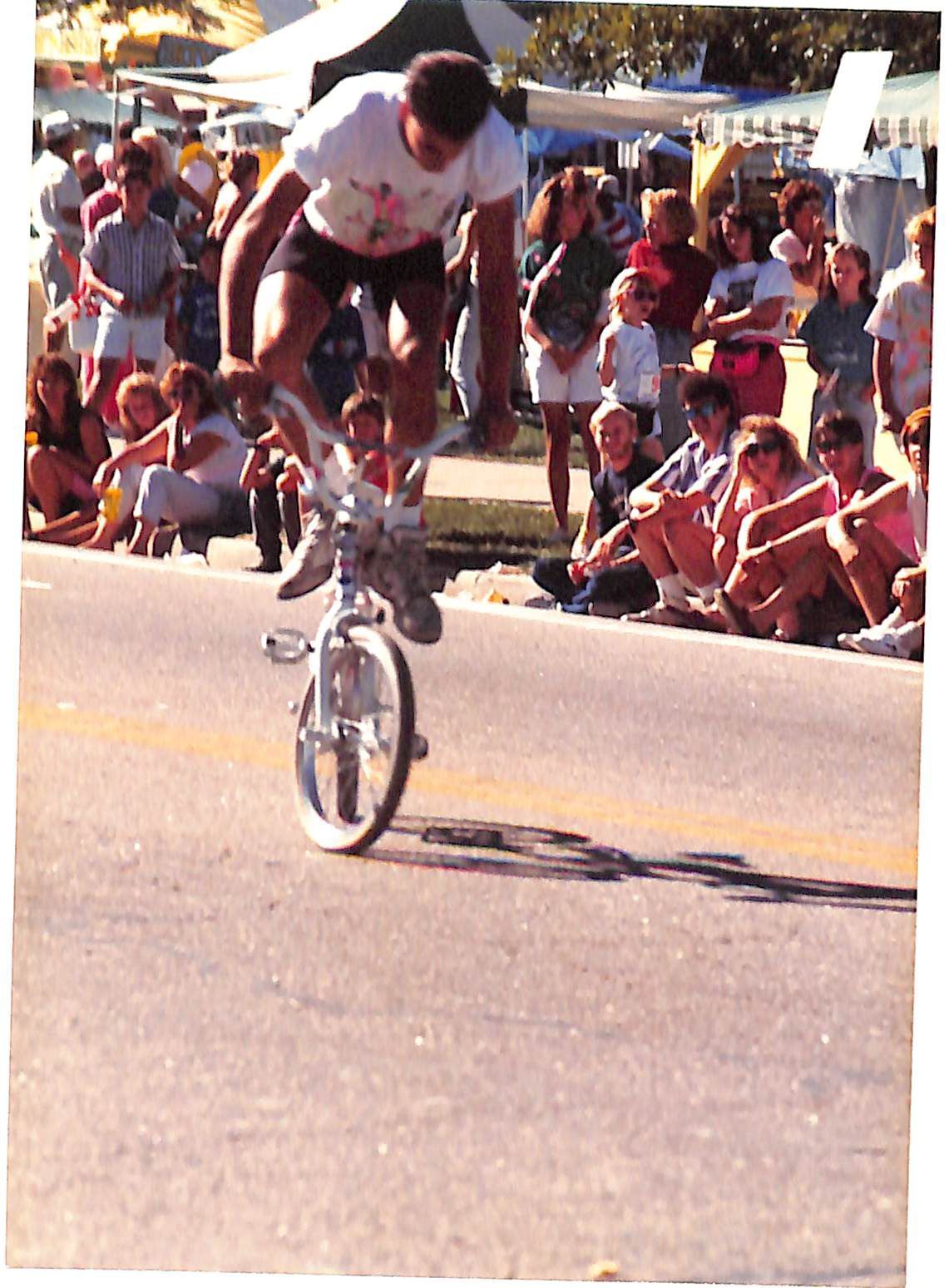 Item is a photograph printed on Kodak paper taken during the 1989 Broomfield Days celebration. In the photo, a young man with brown hair wearing a white t-shirt and black shorts expertly rides a unicycle down the street. Behind him, crowds have gathered on the side of the road to watch him and the rest of the parade go by. White and blue tents hosting festivities and carnival games are visible in the background, along with some trees.Photograph Details