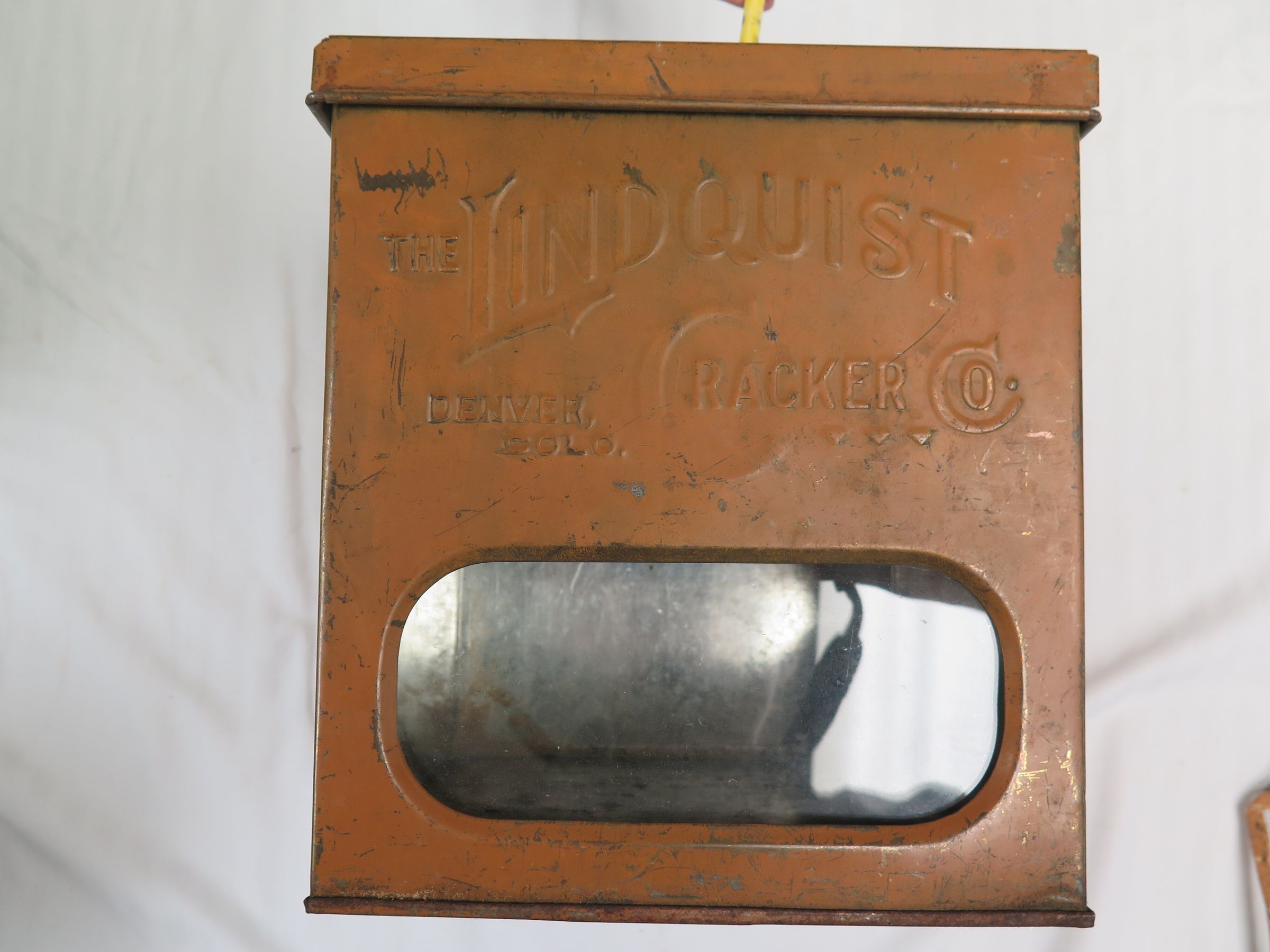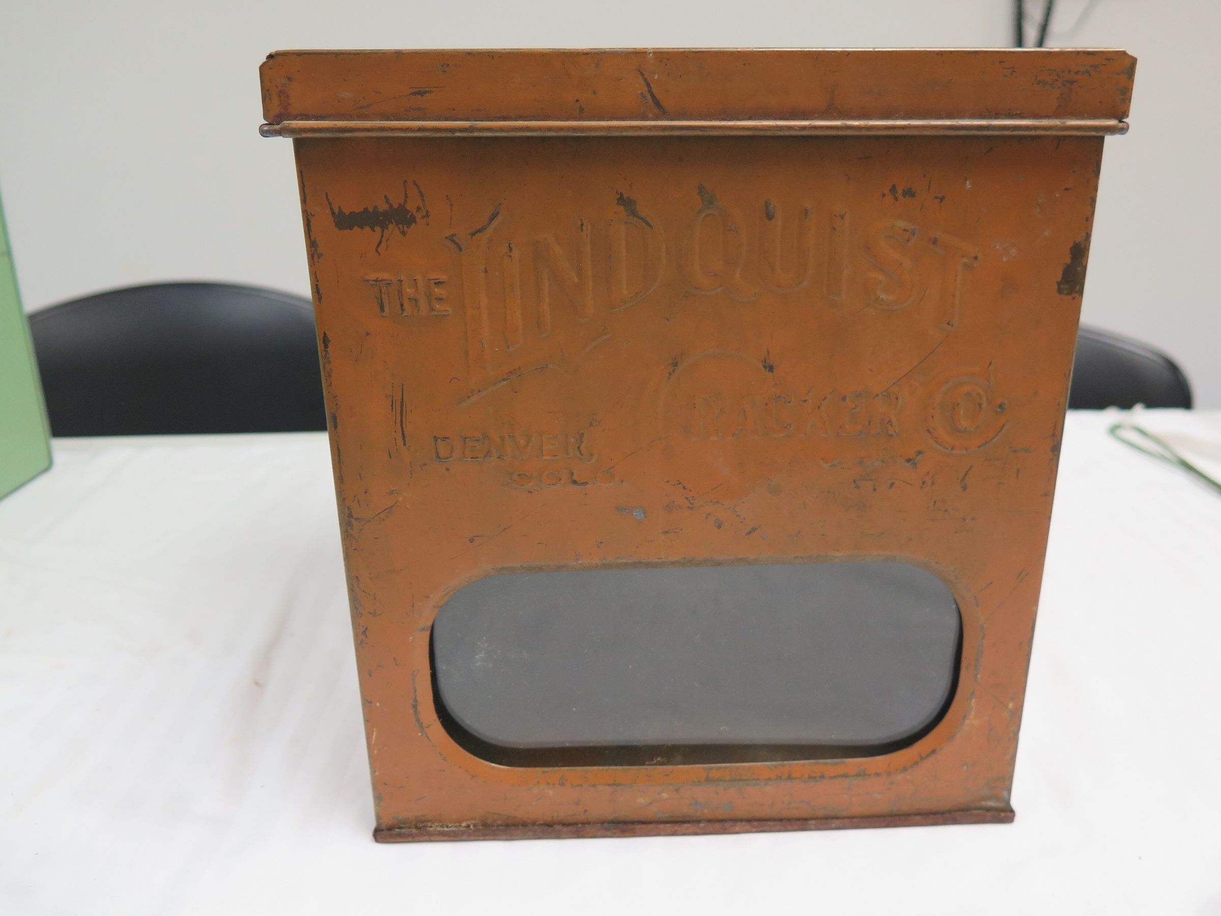 This is an orange metal cracker tin with a clear plastic window. The front of the tin has text that reads, "Lindquist/ Cracker Co./ Denver, Colo.". The tin measures 10" (h) x 9" (w) x 9" (l).
