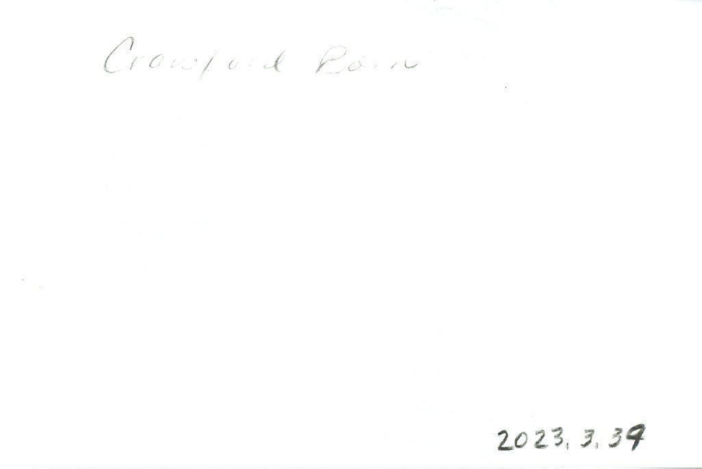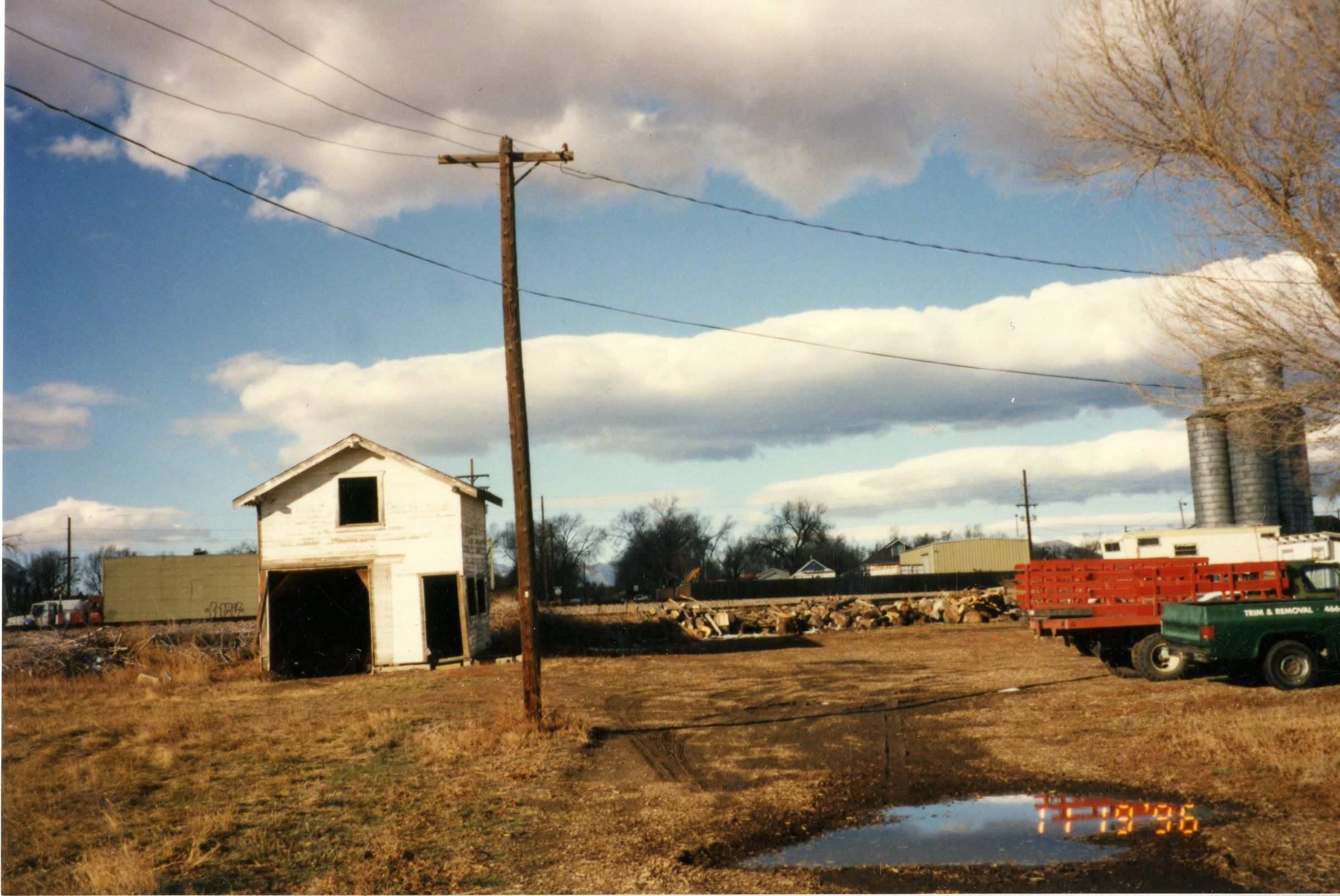 Color photograph of the Crawford barn. Two story building with two doors and three windows shown. Doors and window glass is missing. Open gable, shingled roof, wood siding, painted white, heavily chipped. Located in a field of dried grasses and weeds with trees and railroad in the background. Zang grain elevator shown to the right, with two trucks, one green, one flatbed with red panel sides. Building is believed to have been demolished. Photo taken 11/19/1996.