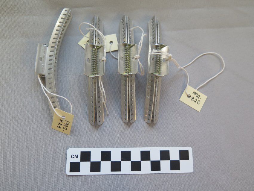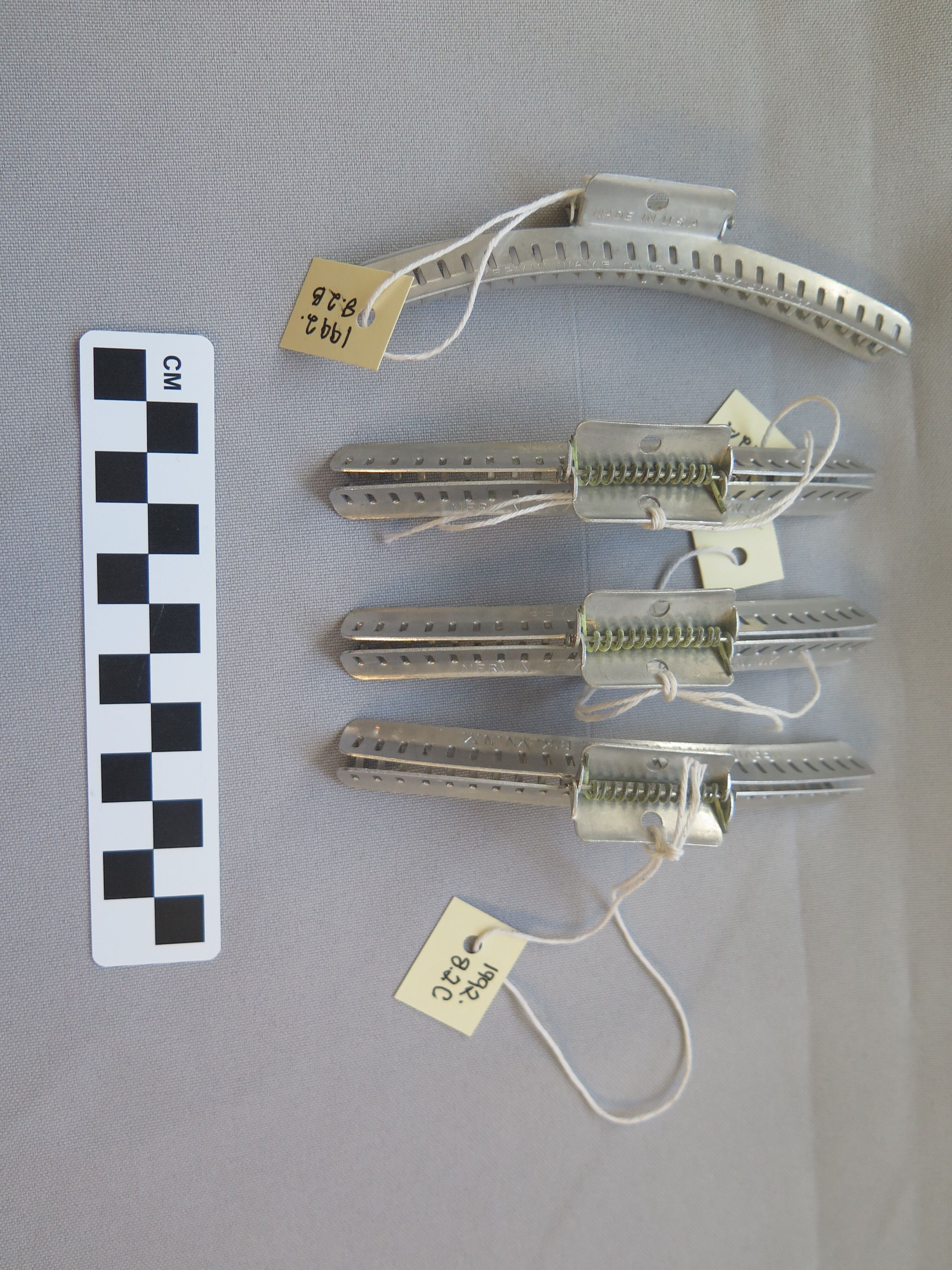 a set of 4 "Mervin Wave Clip" hair clips with spring opener, aluminum wave holders/ Labeled A, B, C. D Patent pending 1.889.166