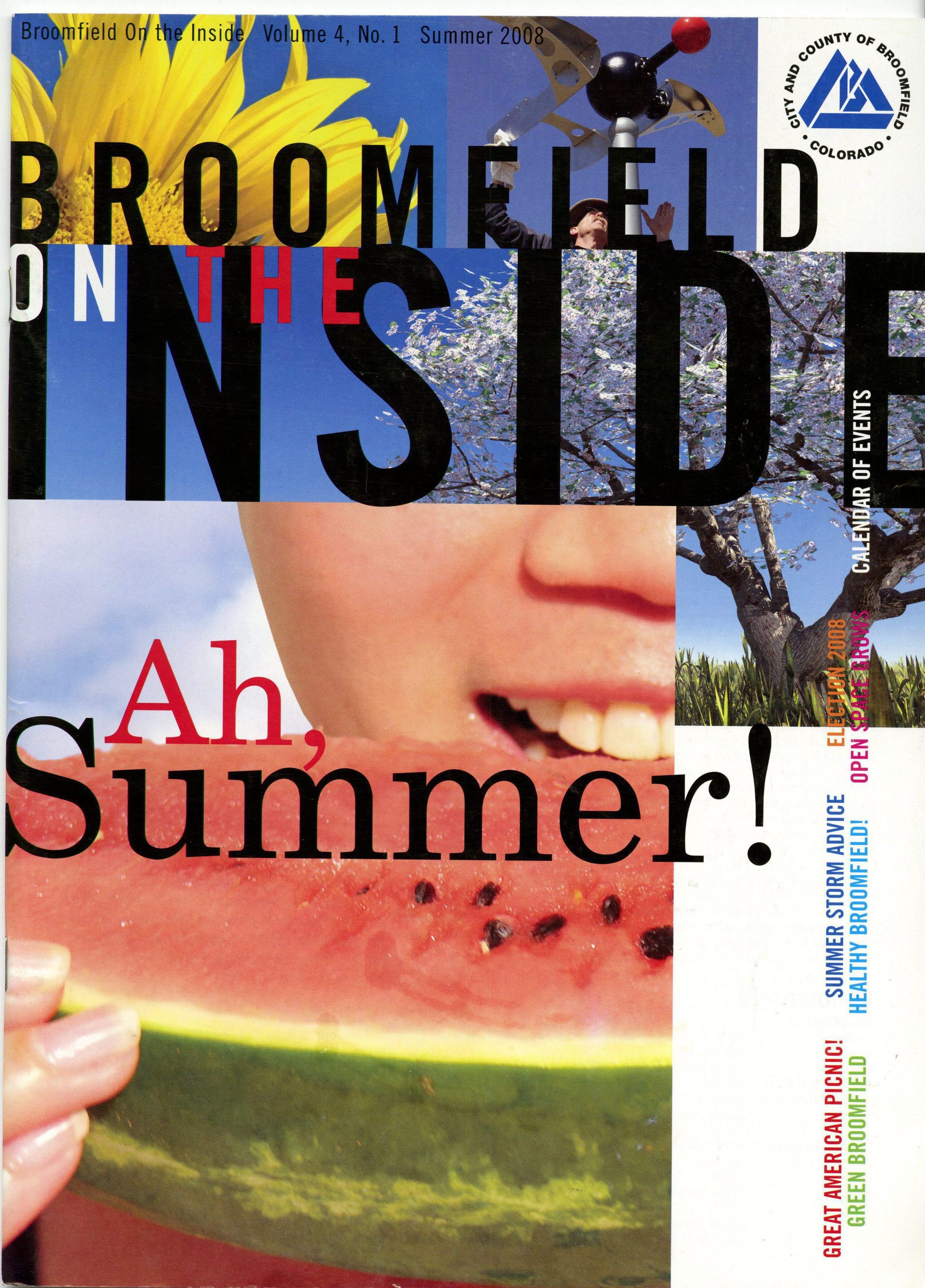 A copy of "Broomfield on the Inside." It is volume 4 number 1 from Summer 2008. Articles include "Calendar of Events," "If it's August, it's National Night Out," "Election 2008," "Summer reading for everyone," and "Broomfield Days."Publication Details