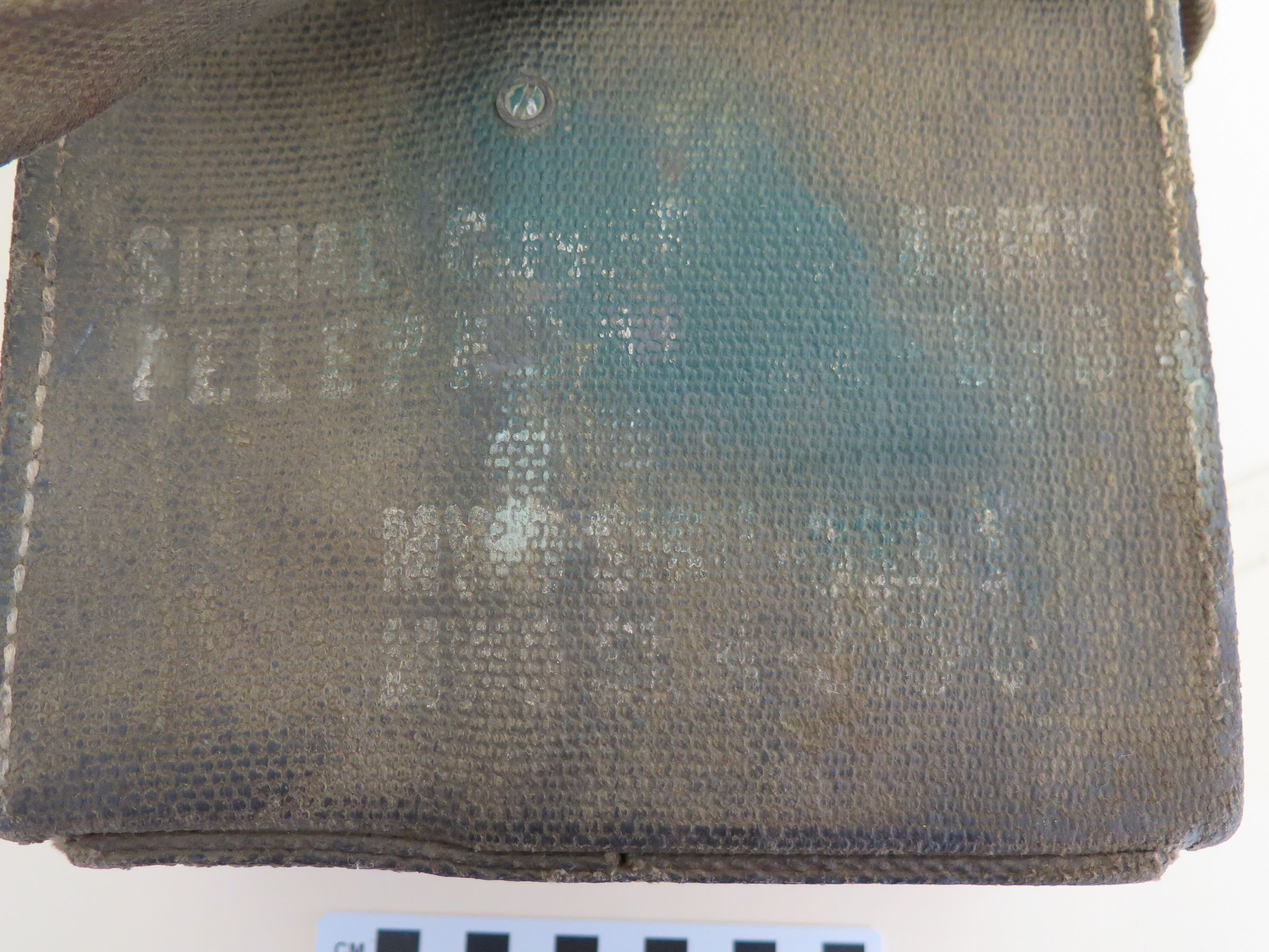 This is an U.S. Army Signal Corps field phone in a canvas case. The case measures 12.5 (h) x 8 (w) x 4 (d) and has a strap.