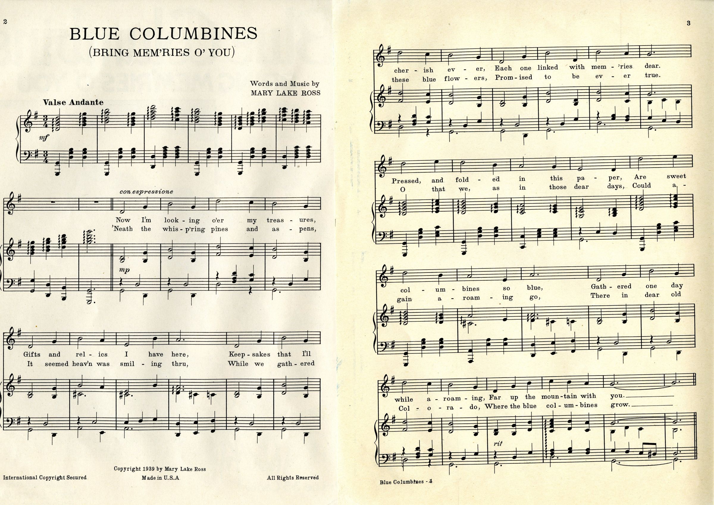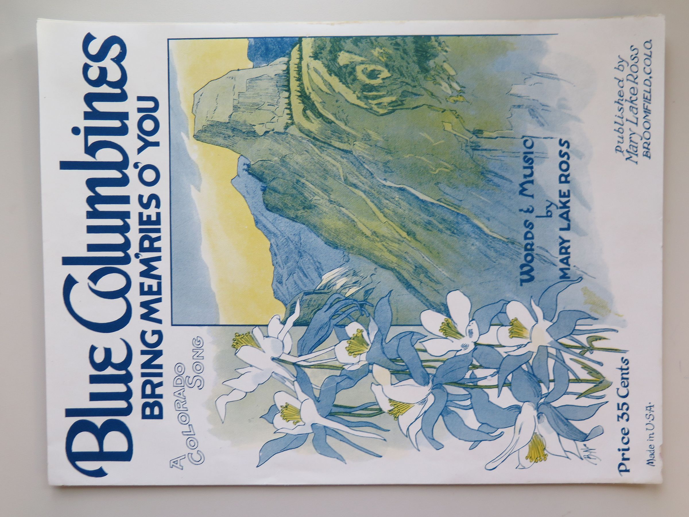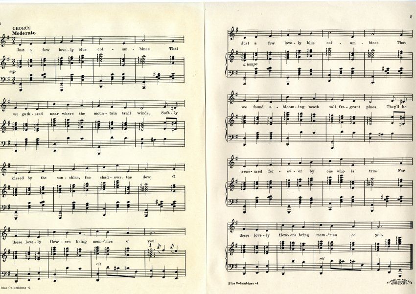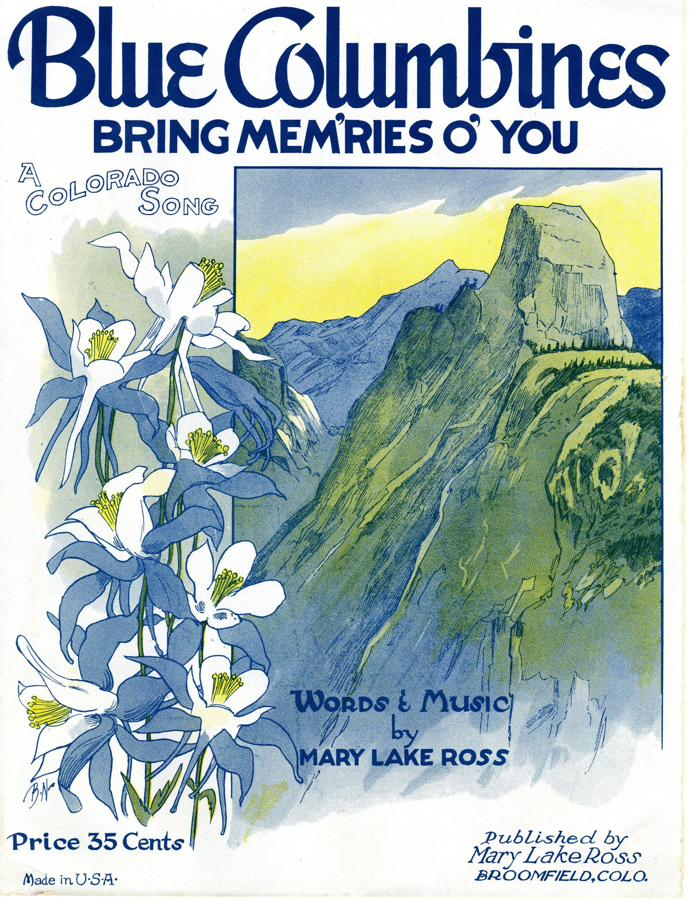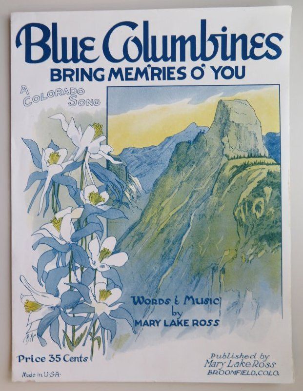 sheet music, "Blue Columbines Bring Memories O' You" A Colorado song. Words and music by Mary Lake Ross. Published by Mary Lake Ross in Broomfield, CO. Music is in perfect condition: no stains and no rips. Copyrighted 1939.