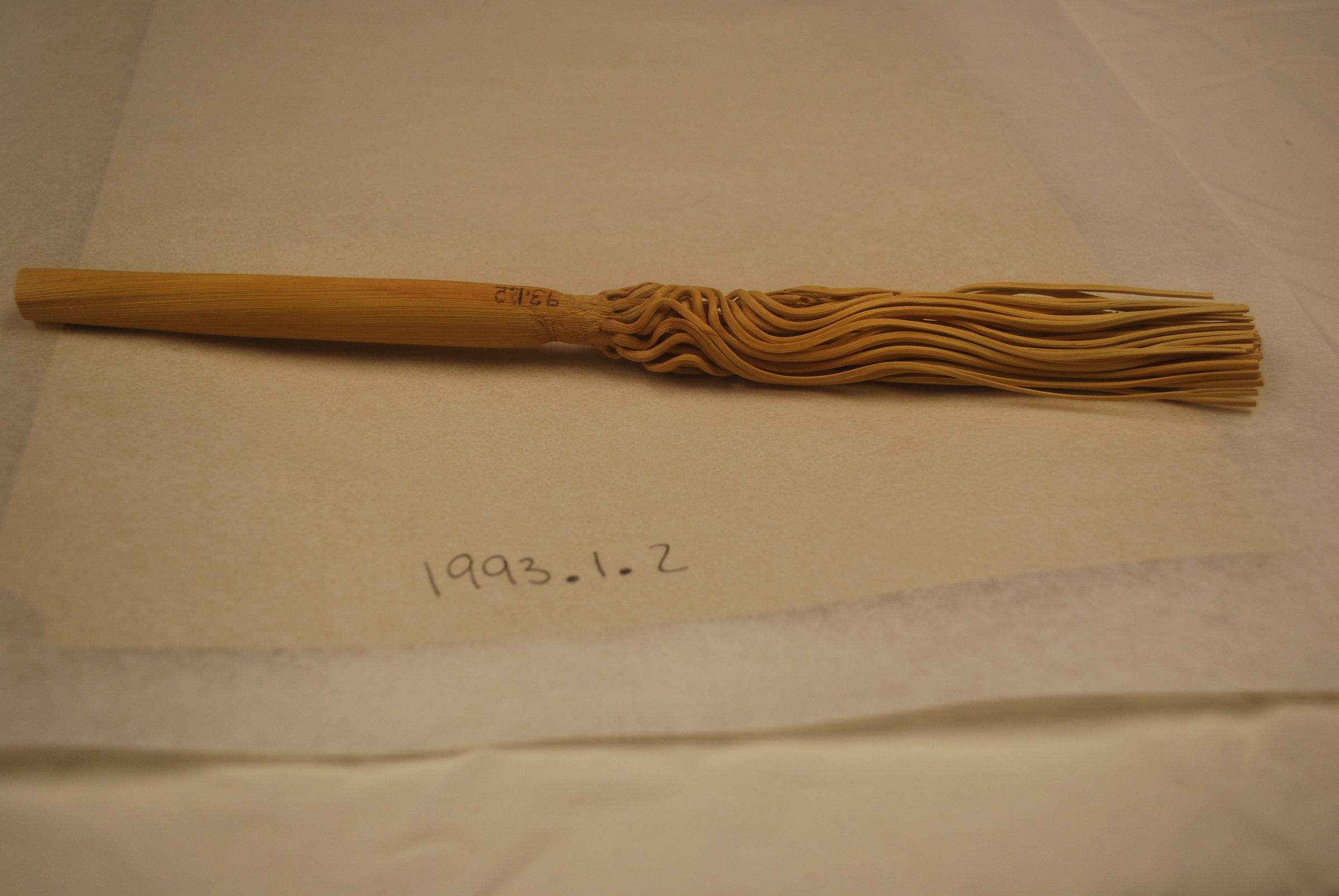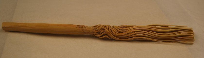 This broomcorn whisk broom was hand made. It measures 9.5" (h) x 1" (d).