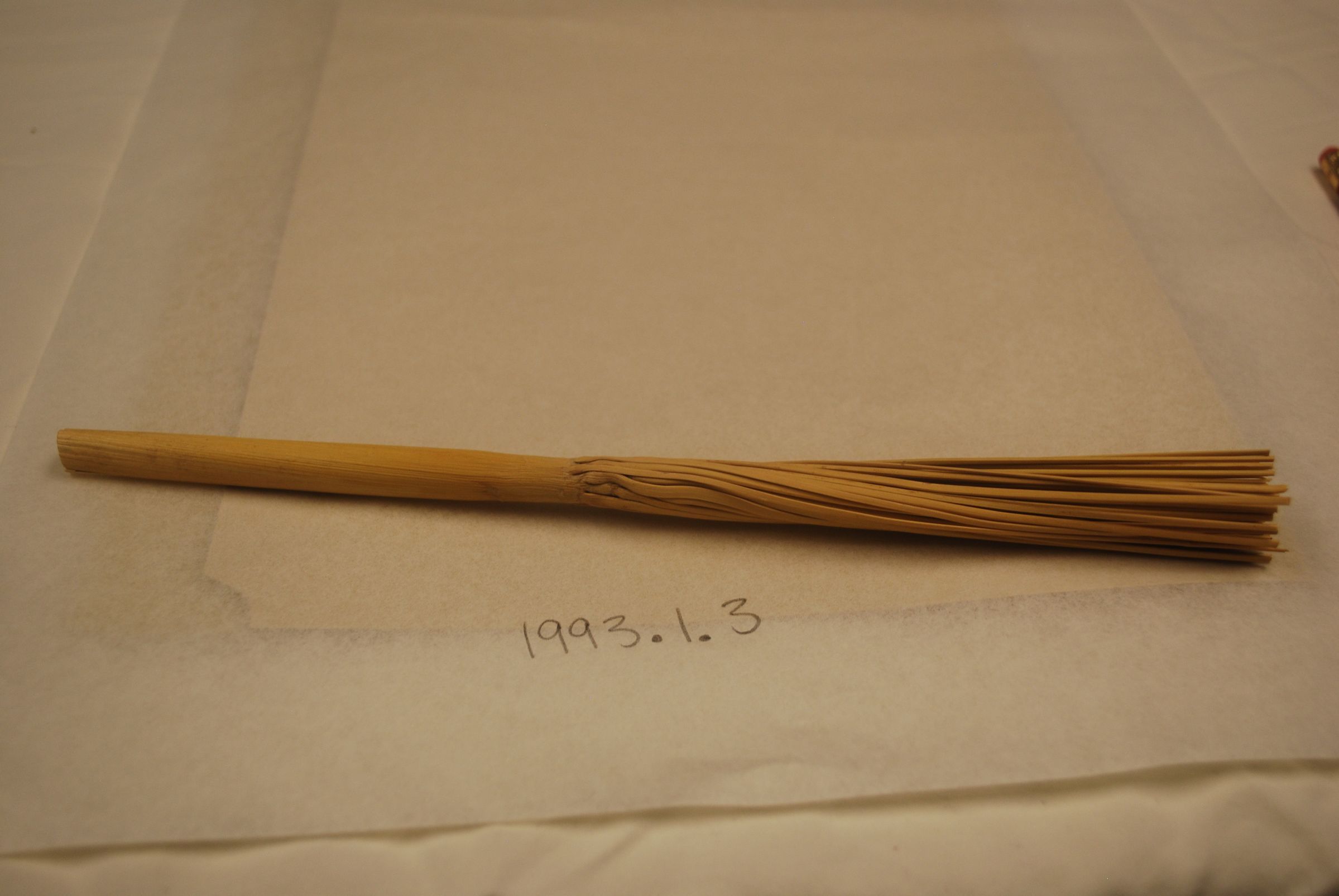 This broomcorn whisk broom was hand made. It measures 9.5" (h) x 0.75" (d).