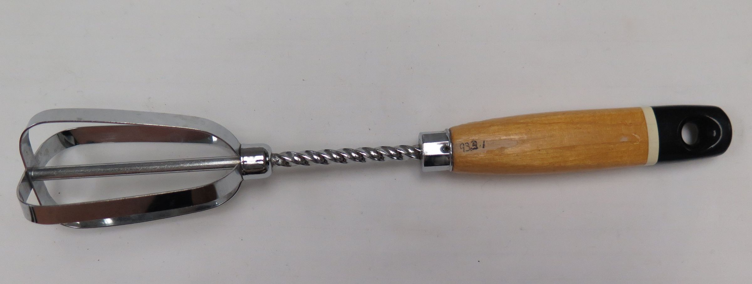 This is an eggbeater with a wood handle. This egg beater does not have any mechanism to aid the cooker. It is just a handheld device. The handle is mostly unpainted, but the end is painted black and has a hole to hang the beater. The eggbeater measures 2" (w) x 10.5" (l).
