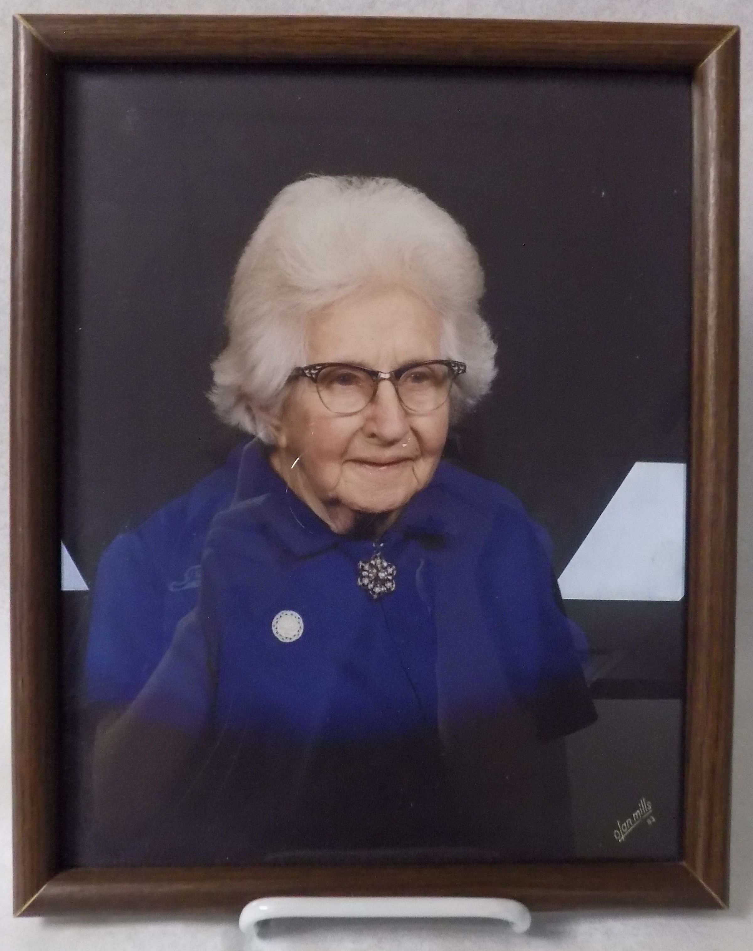 Item is a framed portrait of Viola Crooks, who was born on August 12, 1889 in Arvada, Colorado. Her family moved to Broomfield in 1893 when she was just four years old, and she lived there for ninety years until her death on August 1, 1985. In the portrait, Viola has short white hair and a black pair of glasses. She wears a blue collared shirt with a bejeweled brooch. The frame is made of a dark-colored wood. Crooks had kept diaries outlining her life in Broomfield, which provide invaluable insight into the development of community lifestyle.Photograph Details