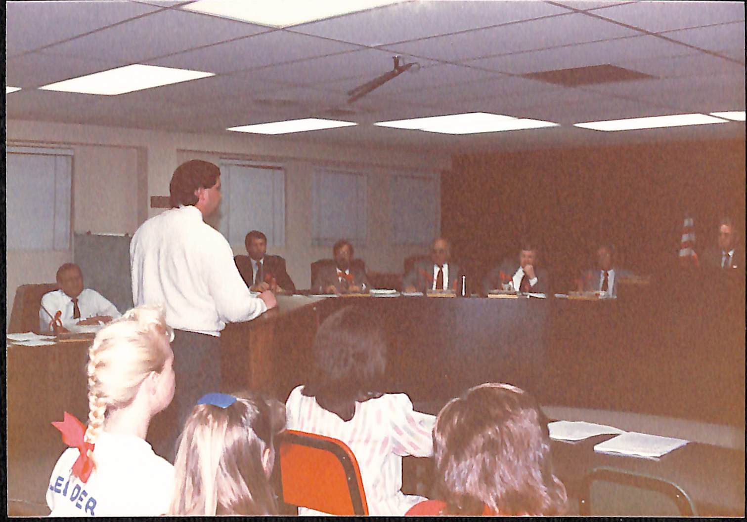 Item is a photograph printed on Kodak paper most likely taken during the late 1980s or early 1990s. The photo centers around a man in a white shirt speaking to Broomfield City Council in front of a podium in a room with a tiled ceiling, windows covered by blinds, and a light-colored left wall. Behind the man is a long curved desk that members of the Council, each wearing a suit and tie, sit behind as they listen. A man on the far left sits at a taller desk with an American flag next to him. In front of the man speaking, three teenage girls sit in front of a table with papers on top of it. They likely represent the Teen Task Force and are preparing to speak.Photograph Details