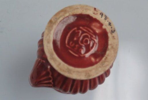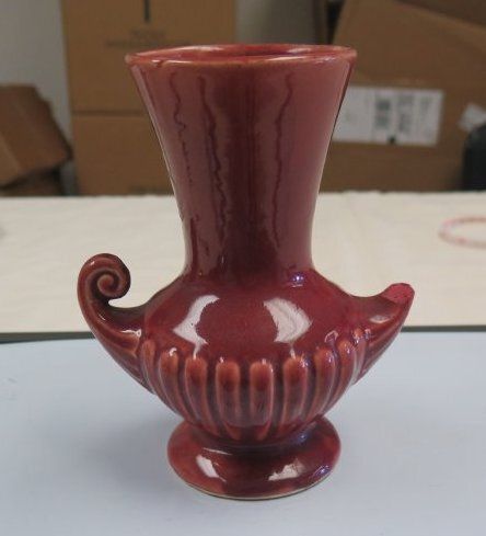 This is a red glazed ceramic McCoy vase. One side handle is broken. The vase measures 6"(h) x 5" (w) x 2.75" (l).