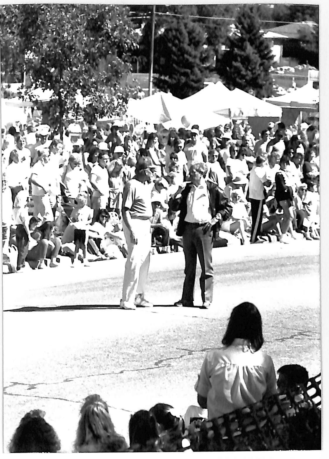 Item is a black-and-white photograph taken during the 1989 Broomfield Days celebration. In the photo, two men are standing in the street as part of the parade. One is wearing a baseball cap, and the other has a leather jacket and watch on. Crowds have gathered on both sides of the road to view the parade, and the people on the side of the street that this photo was taken from are sitting within a netted-off area. Large trees and white tents hosting other festivities are visible in the background. The men are most likely Les Schuntz and Governor Roy Romer.Photograph Details
