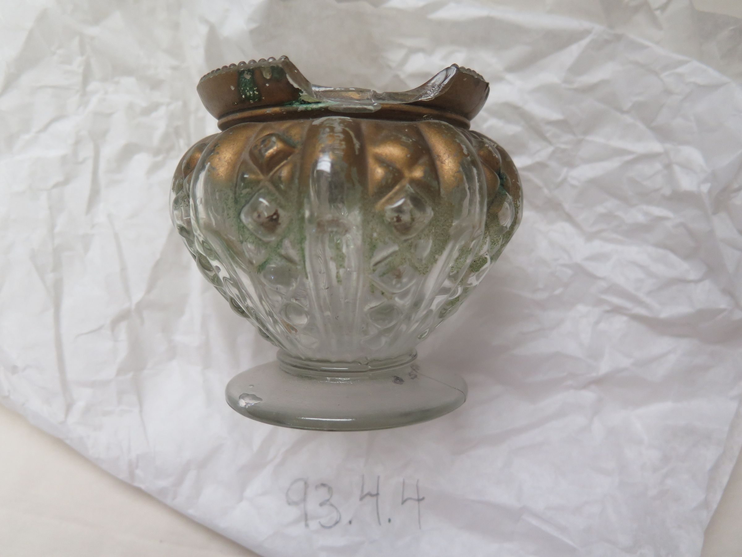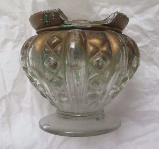 This is a short clear glass vase that looks like it has been partially spray-painted gold. There is a chip in the rim. The vase measures 3.5" (h) x 3" (dia).