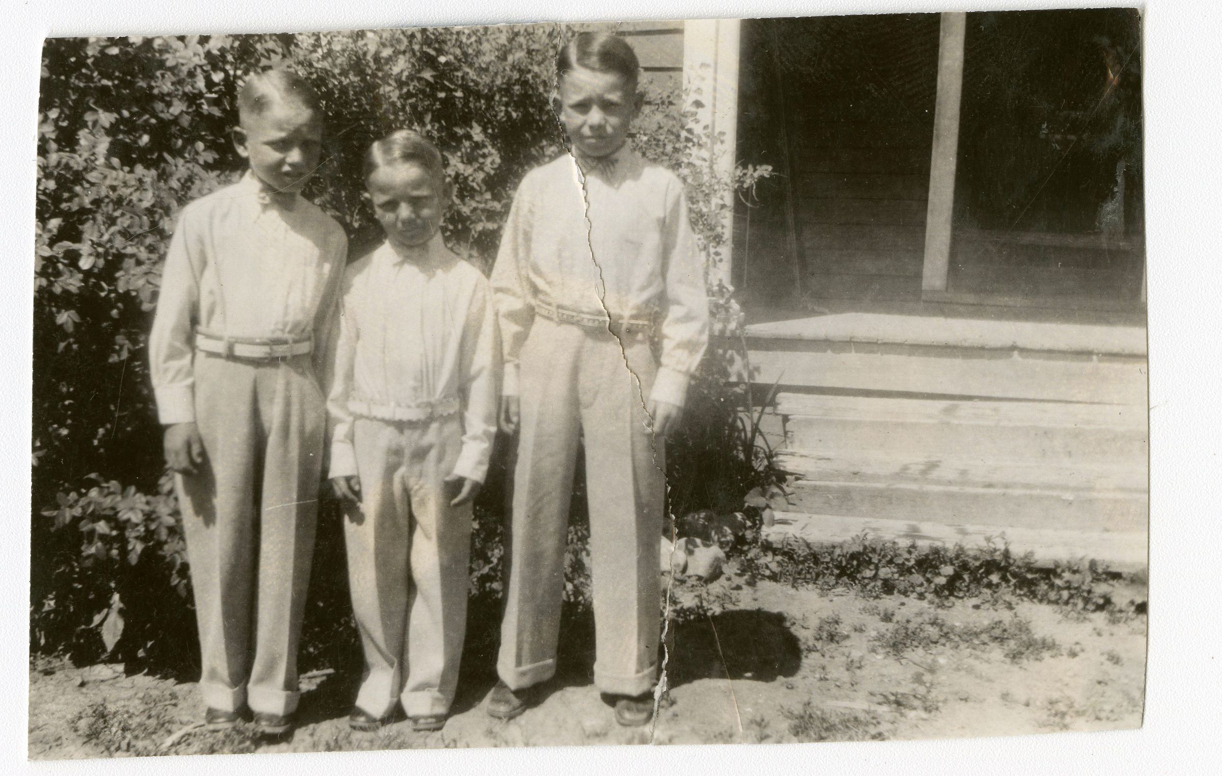 Black and white photograph of three boys. They are identified from left to right as Gib, Dale, and Clyde Brunner.