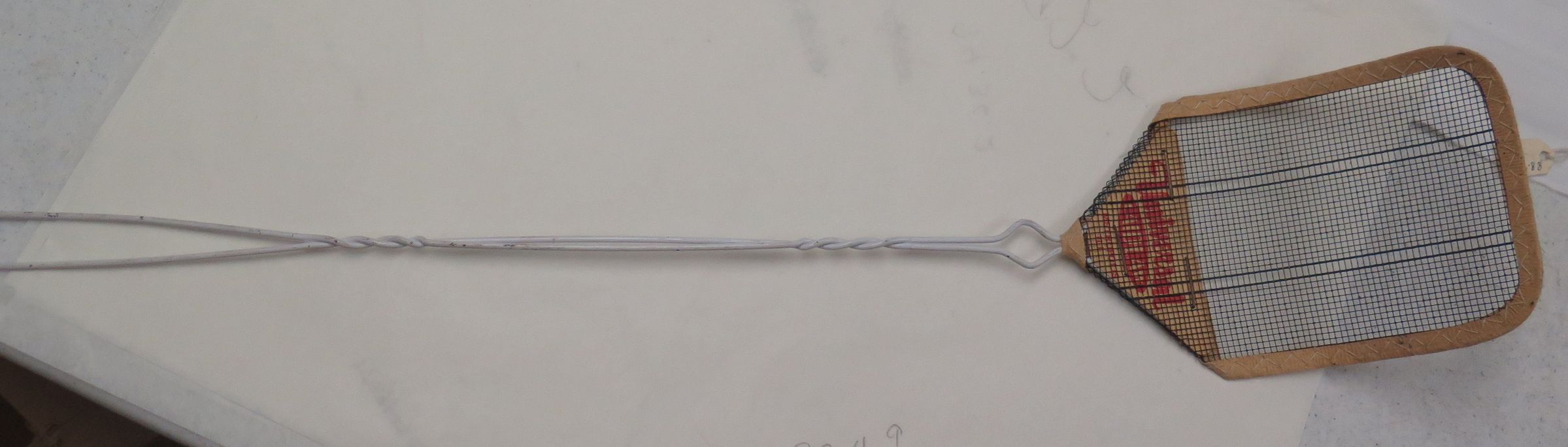 This fly swatter measures 37"(L) x 4"(W). It is made of wire with cloth mesh.