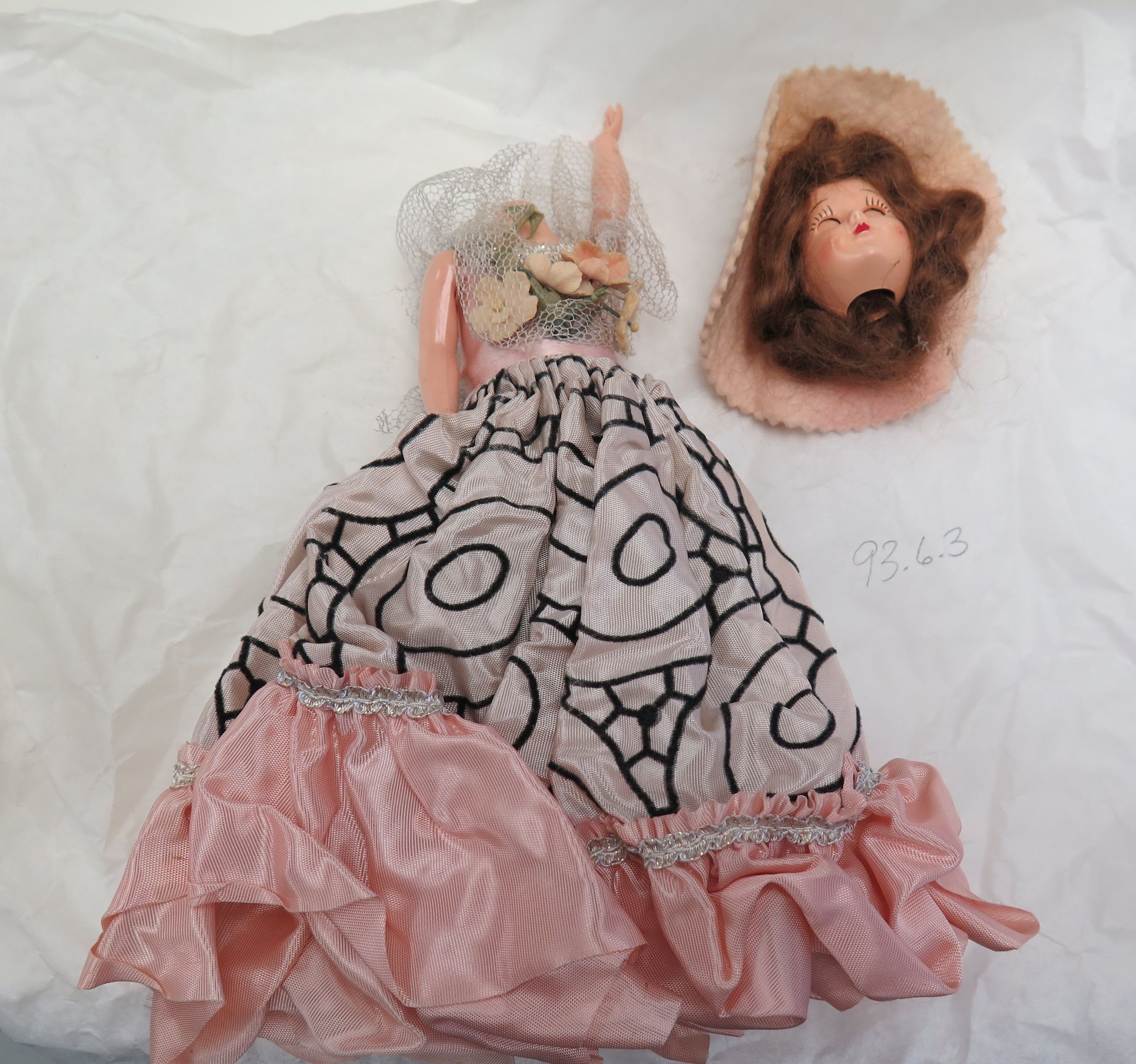 This is a plastic doll with red hair and sleep eyes. The doll is wearing a grey and black dress with pink ruffles around the bottom. The doll has a large pink hat. The head has been removed from the body, but each piece is in good condition. The doll measures 8" (h) x 8" (w) x 2.5" (d).Collection