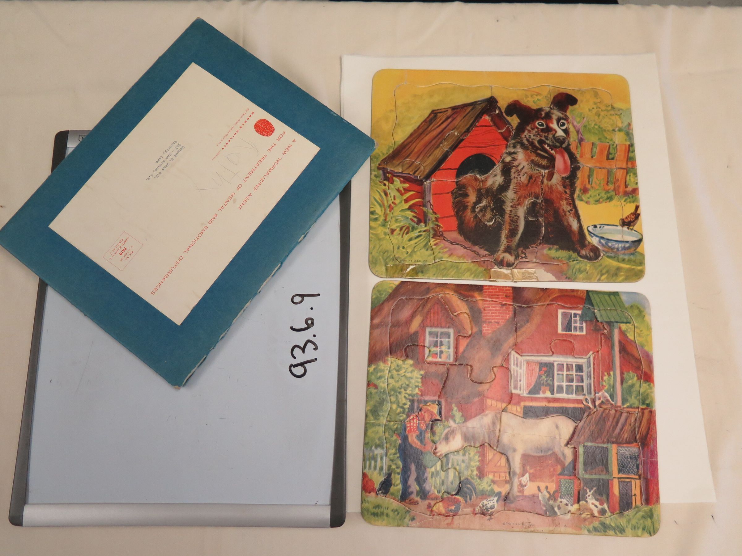 This is two 11" (w) x 8.5" (l) P & M Co. Inc. children's jigsaw puzzles. One has a dog in front of red dog house. The other one has a farmer, horse, and chickens in front of a red house. They are stored in an envelope addressed to Robert Shaw, MD, of Iowa with the return address of Warner-Chilcott in New Jersey. Text on the envelope says "A new normalizing agent for the treatment of mental and emotional disturbances. Handwritten in pencil is the name Kathy.Collection