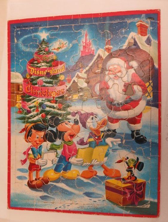 This Disneyland Christmas children's puzzle measures 11.25" (w) x 14" (l) when assembled. It features Santa, Pinocchio, Mickey Mouse, Tinker Bell, Jiminy Cricket, and Donald Duck. It was made in the USA in 1957 by Whitman Publishing Co.Collection