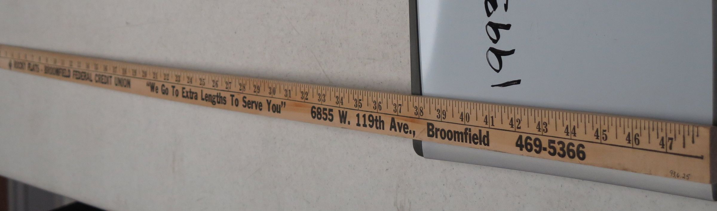 This is a wooden promotional yardstick from Broomfield Federal Credit Union. This yardstick measures 48 inches in length.