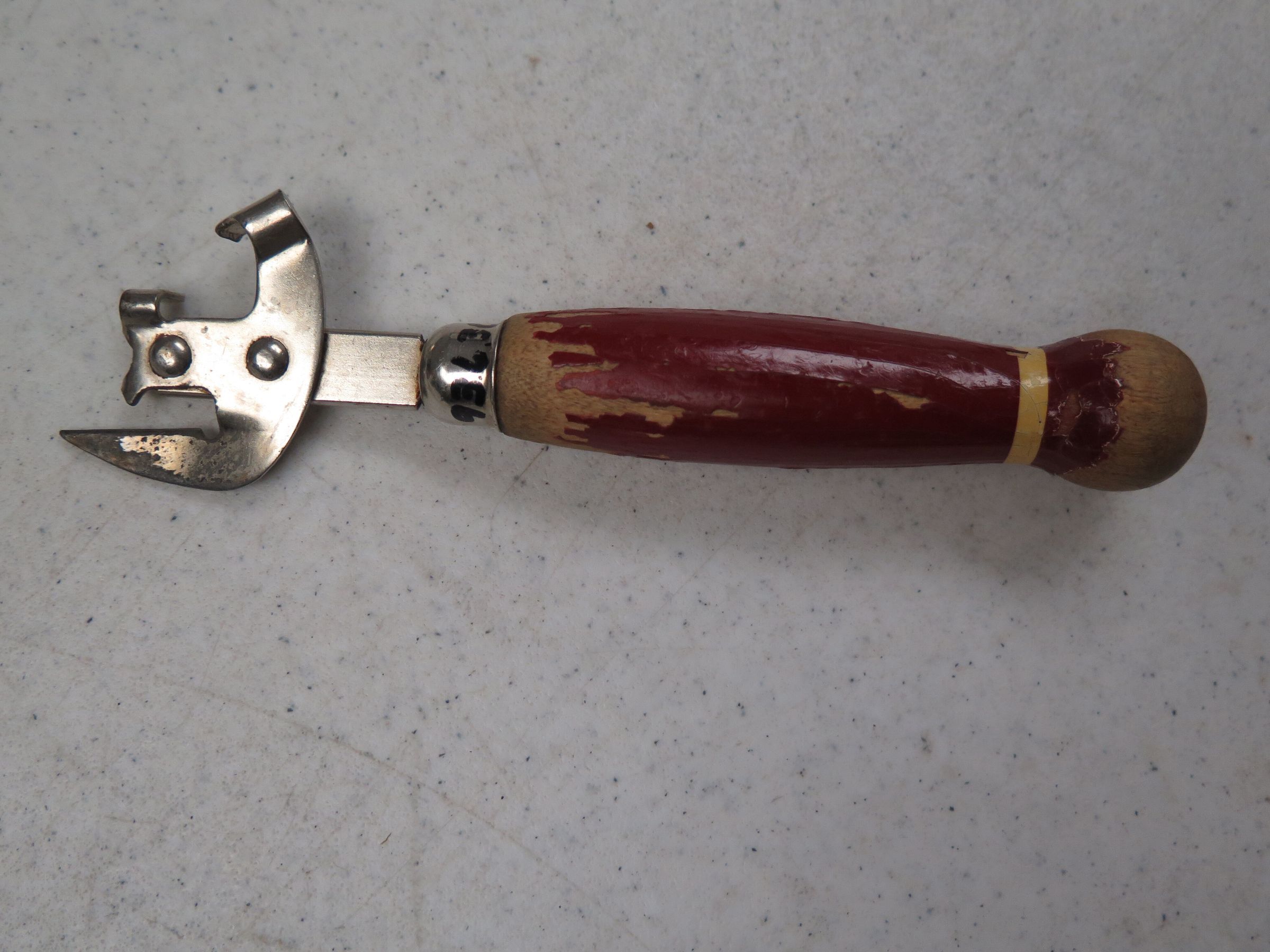 This is a can opener with a red painted turned wooden handle measuring 2" (w) x 6.5" (l).