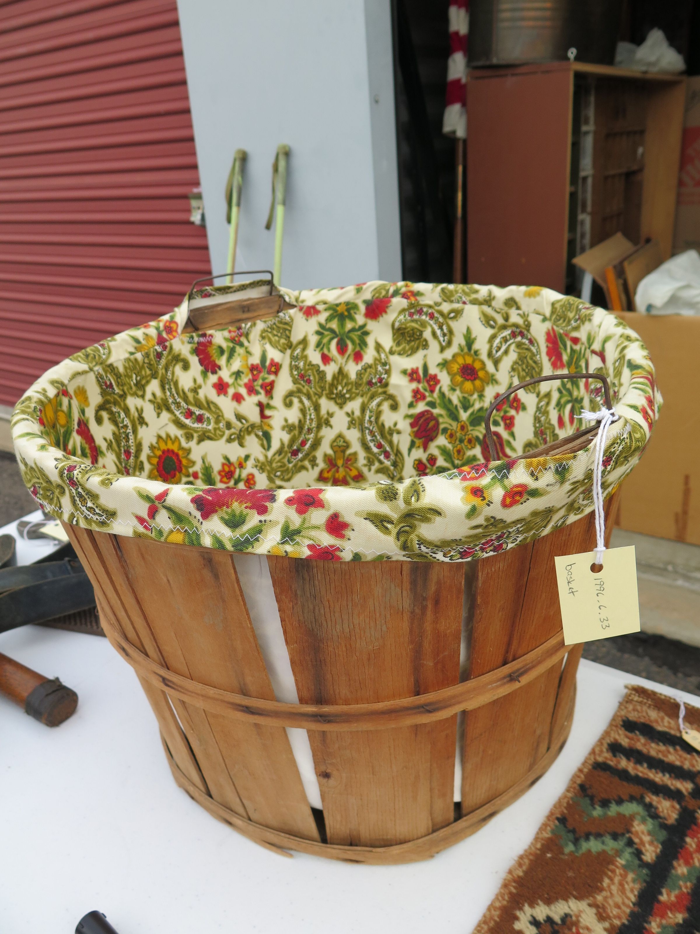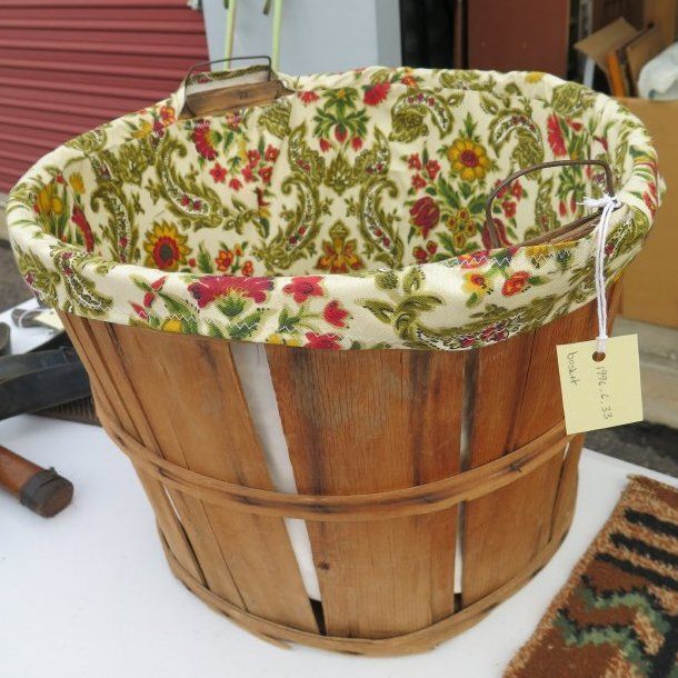 This is a wood bushel basket with a floral cloth liner inside. The basket measures 12" (h) x 17.5" (dia).