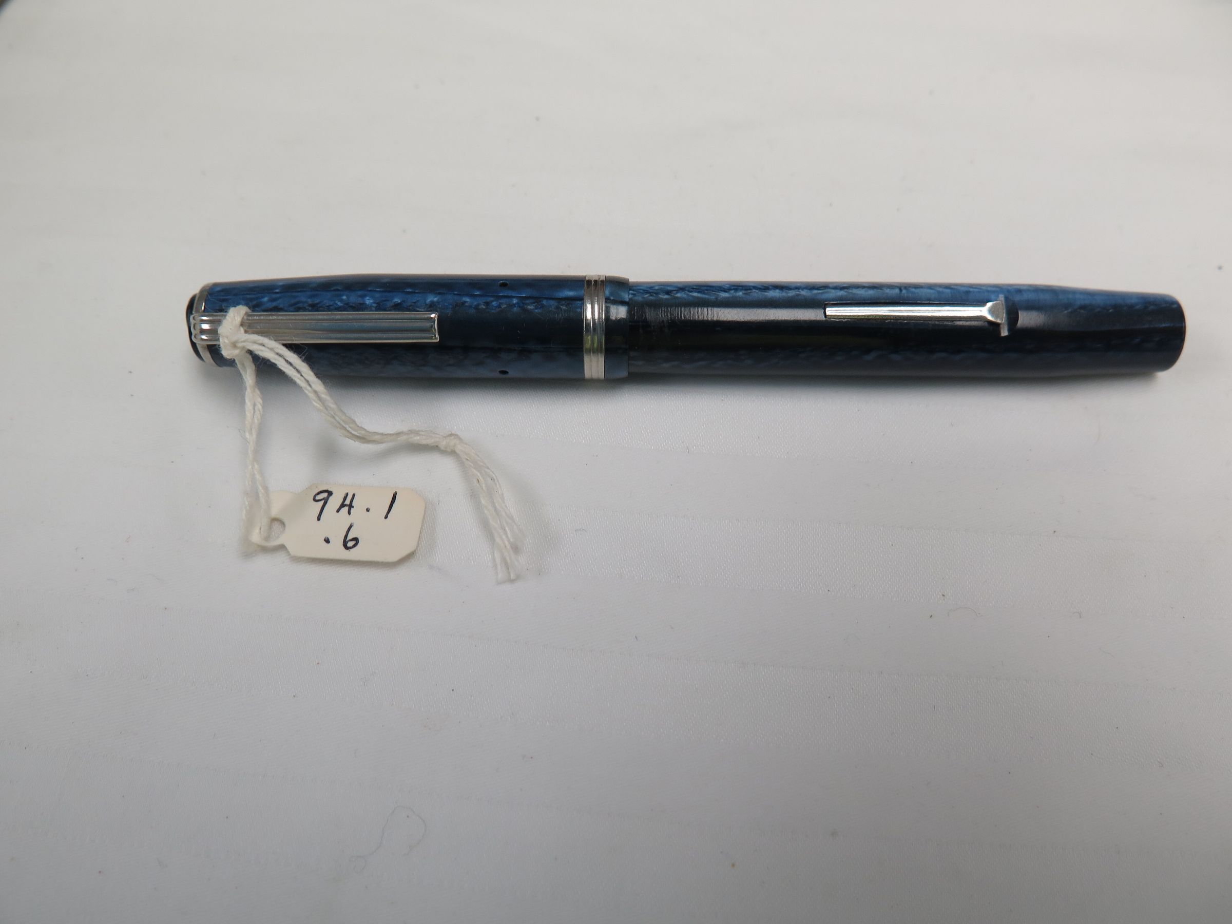 This is an Esterbook brand fountain pen with a cap. The pen is blue with a marbled pattern on it. The pen measures 0.5" (w) x 5" (l).