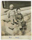 Black and white photograph of two boys sitting on steps leading from the porch to the yard. One boy is wearing pants and a sweater in a light shade. He is identified as Gib. The other boy is wearing jeans and a collared jacket. He is identified as Clyde.