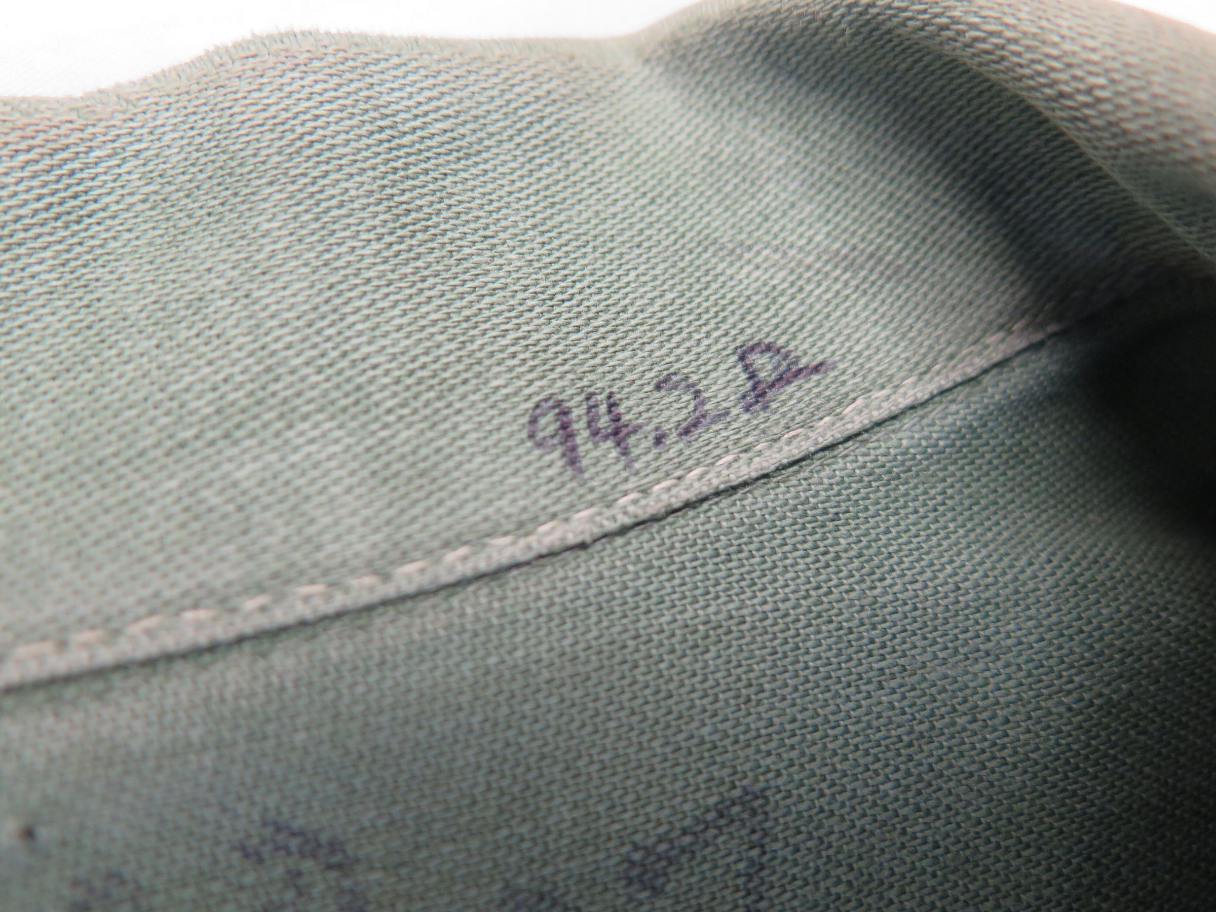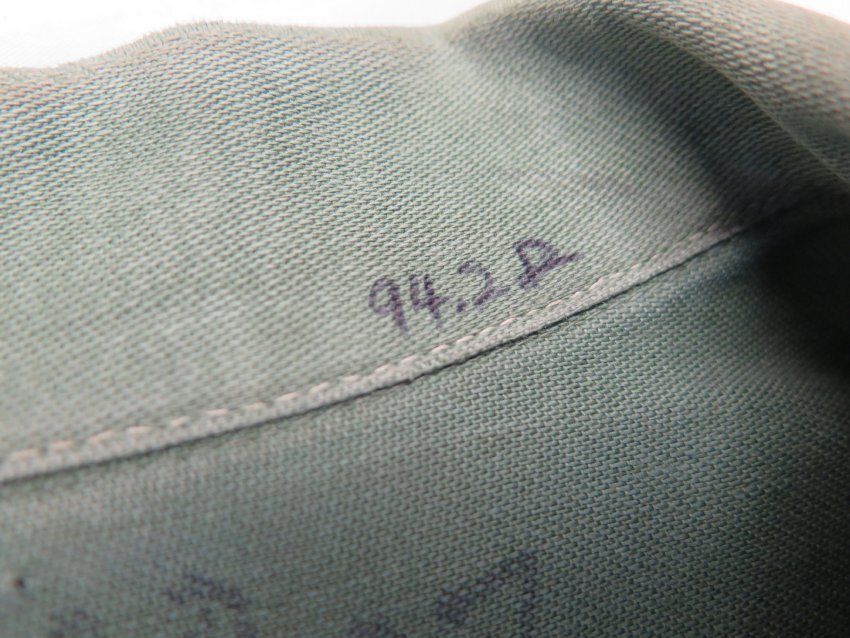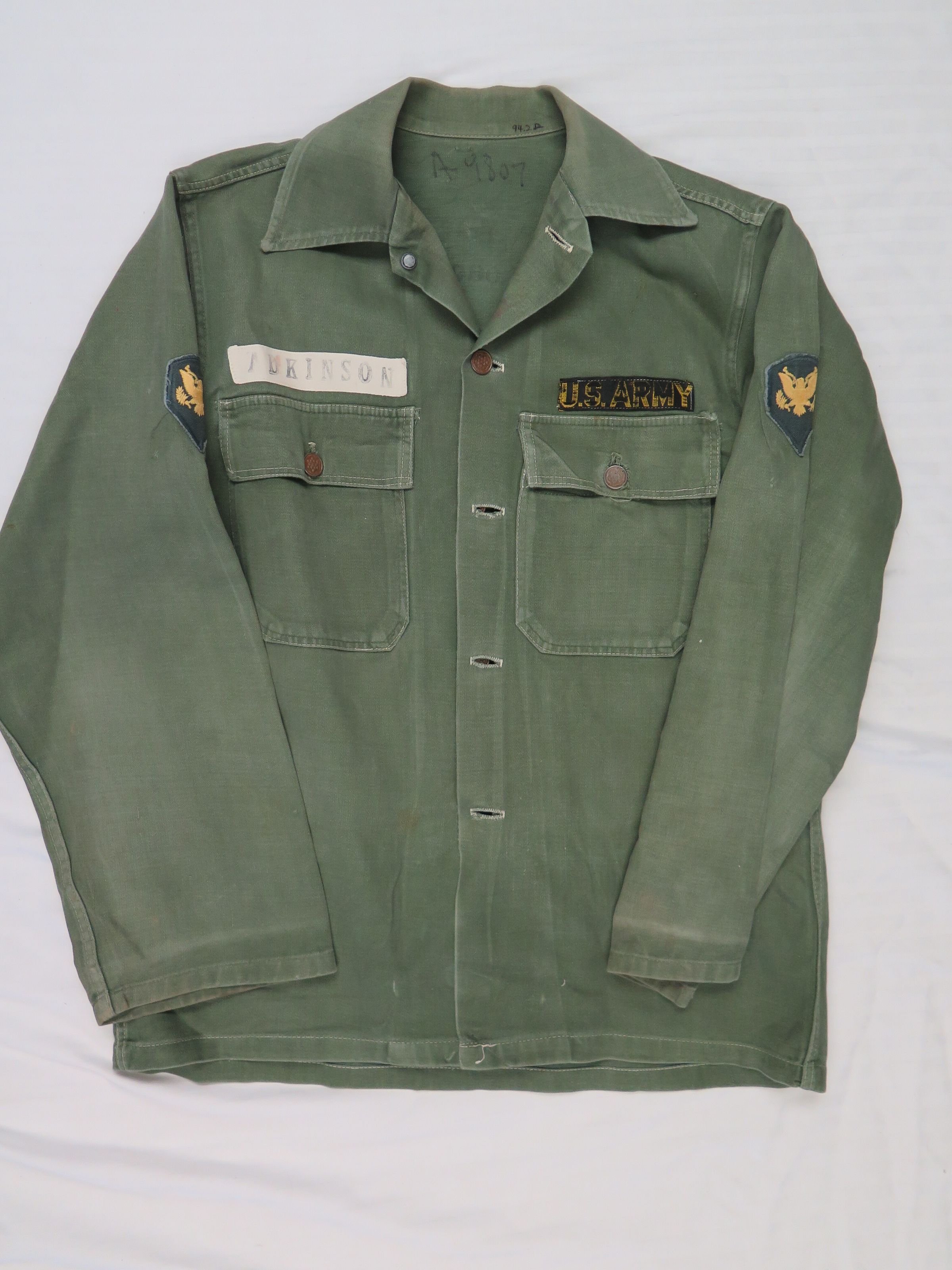 Men's olive shirt from an army fatigue uniform. There are patches above both breast pocks and on the bicep of each sleeve. The shirt is labeled "Adkinson." The shirt measures 17" (w) x 28" (l).