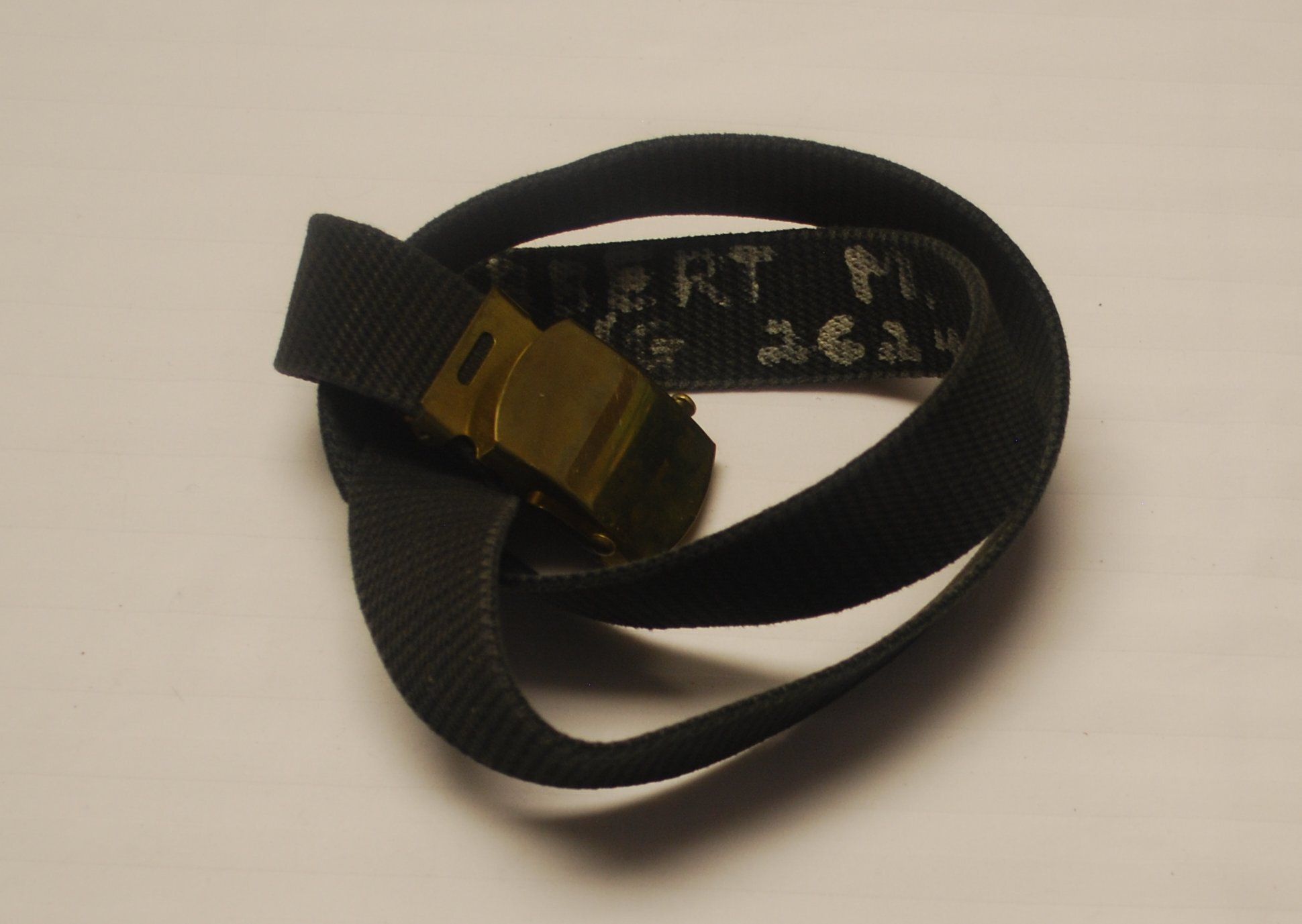 This is a black Army belt with a gold-colored buckle. The belt is marked Herbert M. Goldstein. It measures 1.25" (h) x 35"(l).