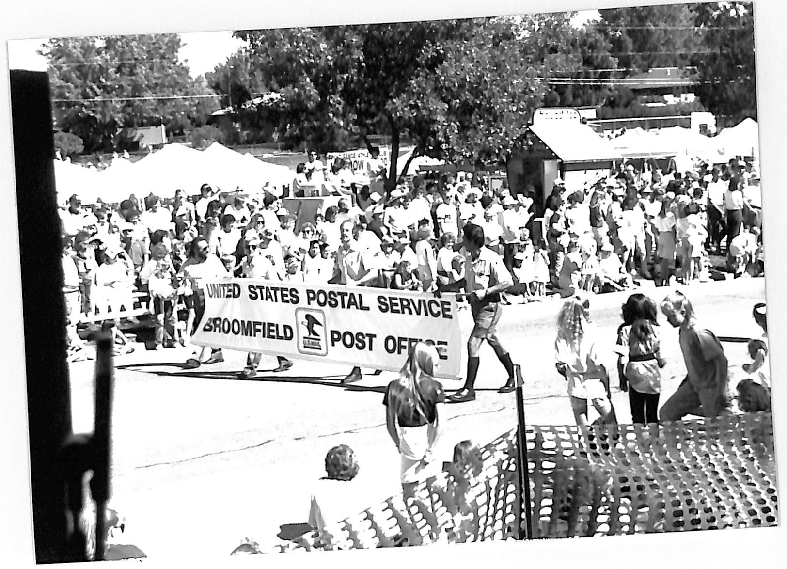Item is a black-and-white photograph taken during the 1989 Broomfield Days event. In the photo, a parade is occurring, and crowds have gathered on both sides of the street to watch. On the side that this photo was taken from, people sit within a netted-off area. In the street, four people walk, holding a banner between them that reads "United States Postal Service Broomfield Post Office," along with their logo. Behind the crowds, white tents and booths hosting other festivities, along with some tall trees, frame the background. The left side of the photo is blocked by a dark blur.Photograph Details