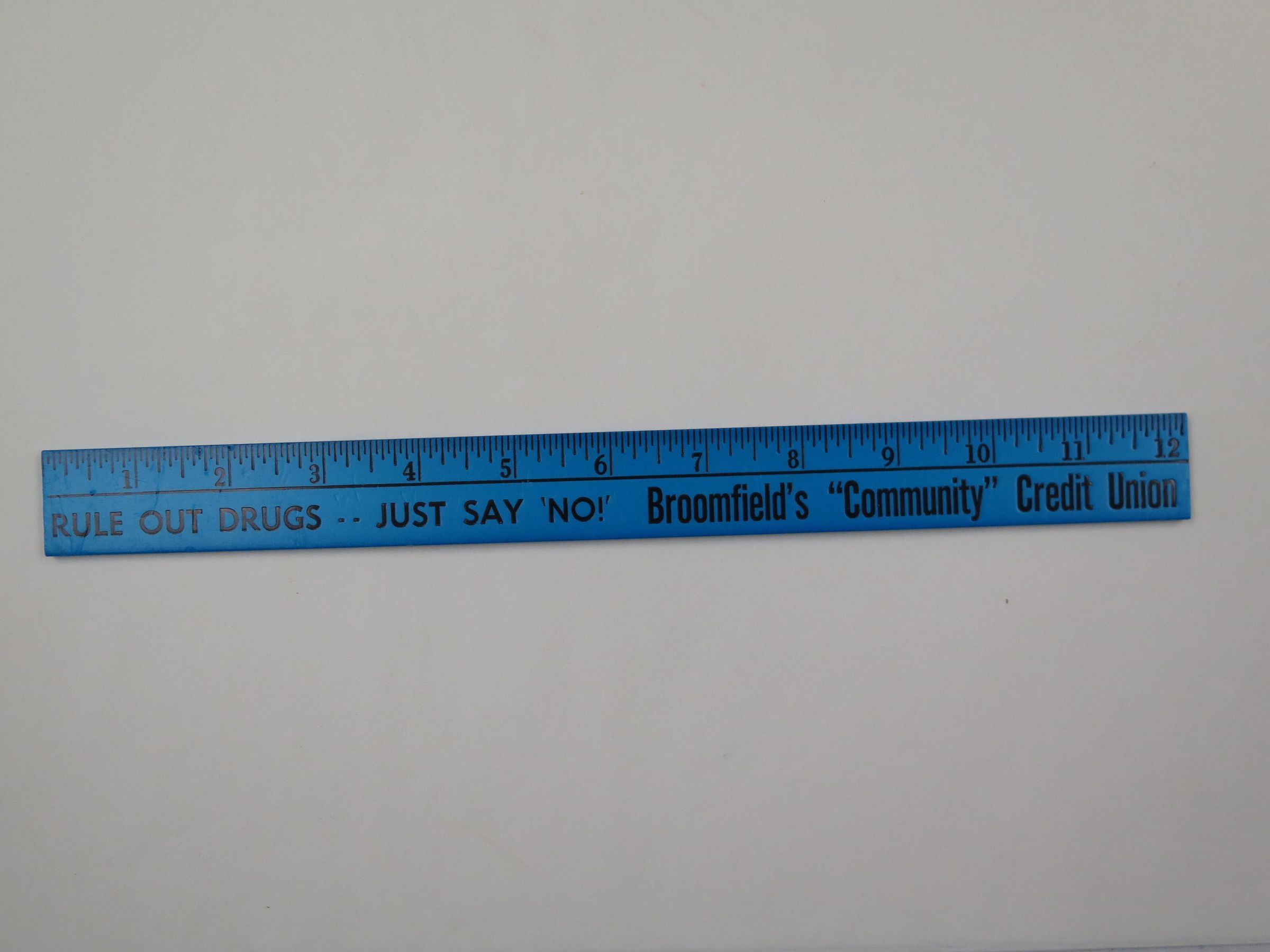 This is a wood ruler that has been painted blue. The ruler has black marks indicating length. The ruler measures 12" (l).