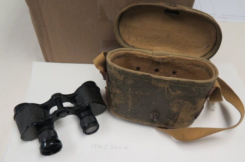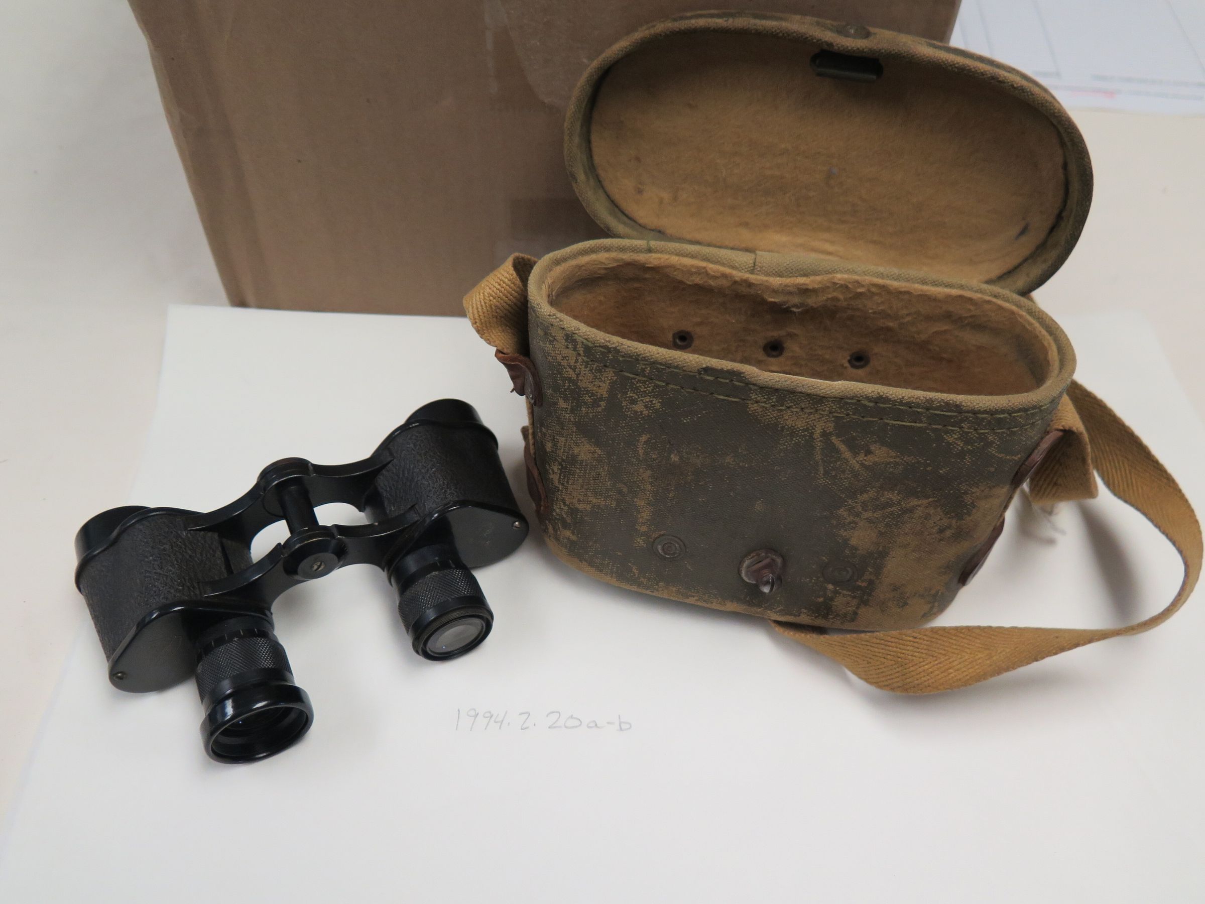 This is a pair of black binoculars in a case. The case is broken and does not close properly. The case has a cloth stap for carrying. The case measures 5" (h) x 7" (w).Collection