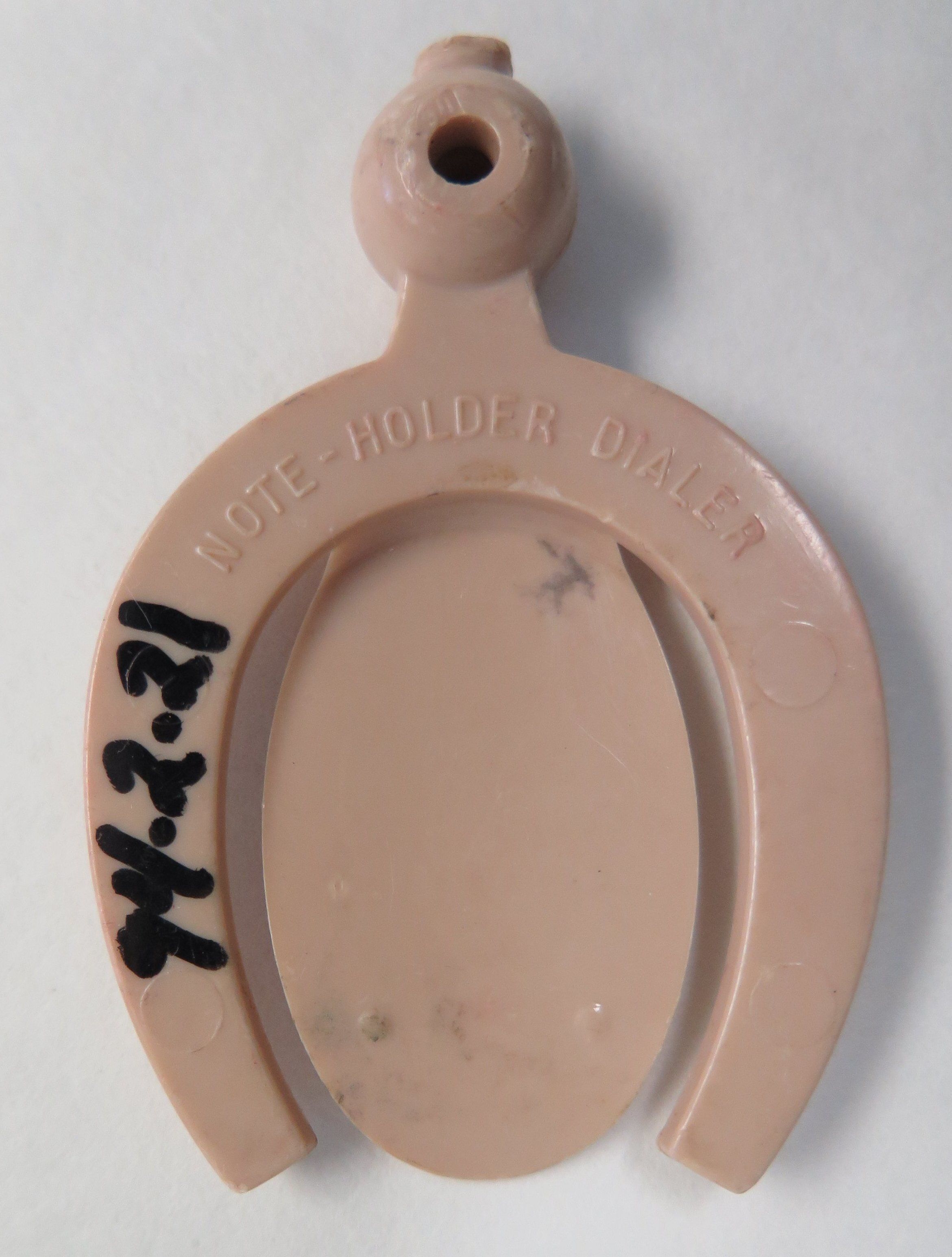 This is a plastic light pink colored device 2.75"(L) x 1.75"(W) that on the reverse is labled: Note Holder Dialer".