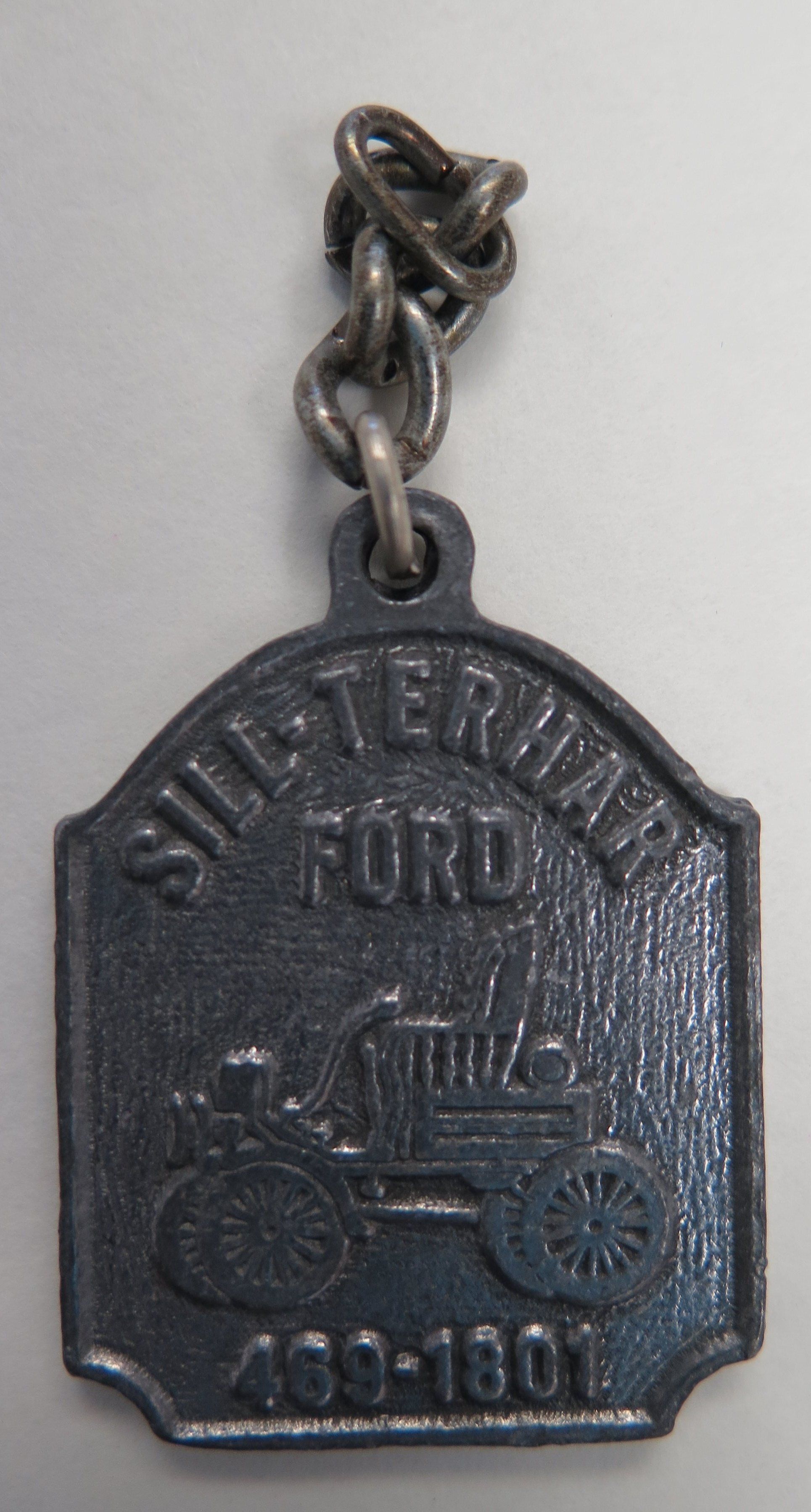 This is black metal key chain 3"(H) x 1.25"(W). Text on the face reads: "Sill Terhar Ford"