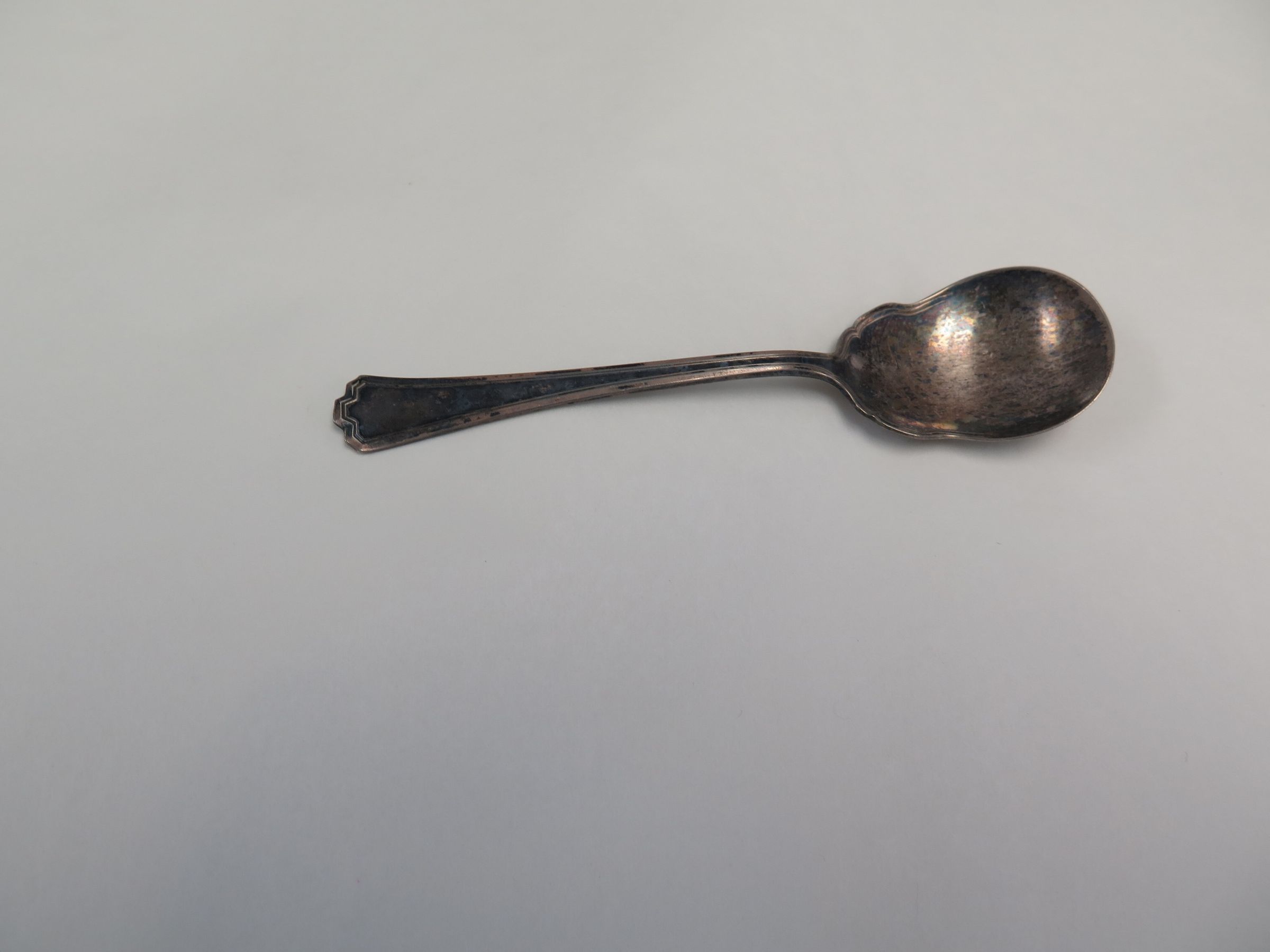 This is a silver plated sugar spoon. The spoon has an indention on the sides where it gets narrower and then wider again. The spoon measures 1.5" (w) x 6" (l).