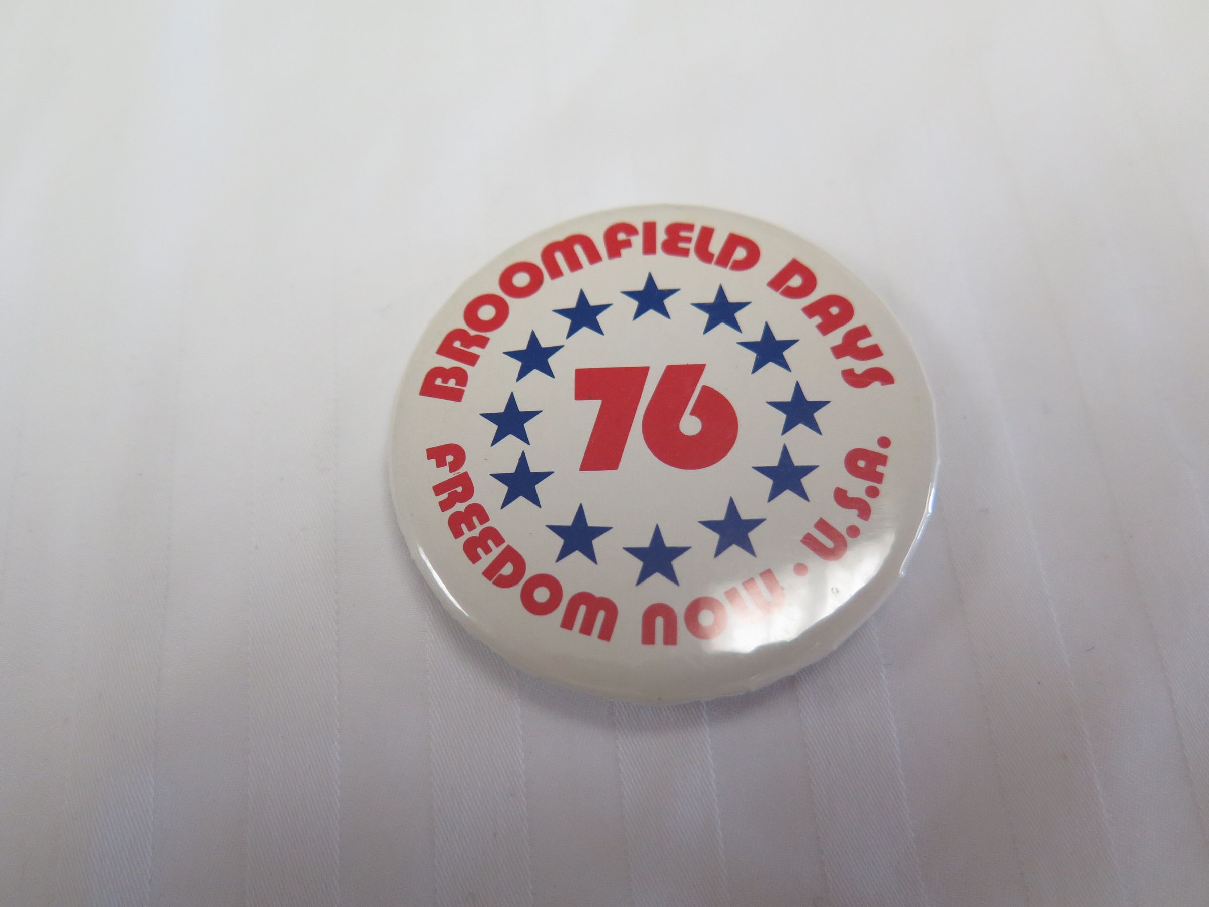 This is a round button from Broomfield Days in 1976. The button is white with blue stars and red text that reads, "Broomfield Days/ Freedom Now U.S.A/ 76". The button measures 2.25" (dia).Collection