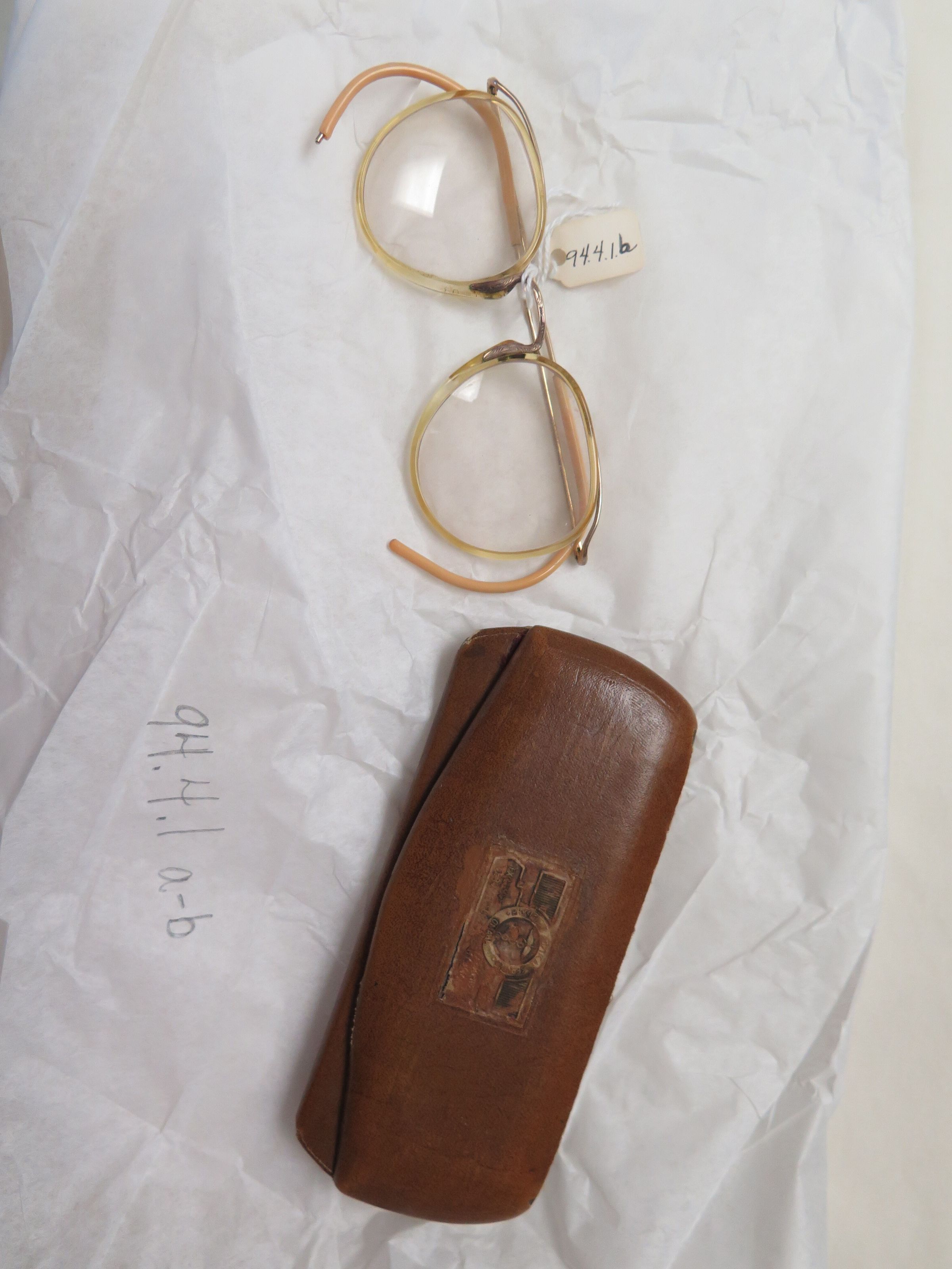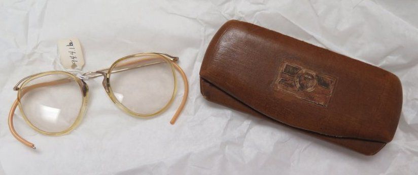 This is a pair of eyeglasses (a) with a case (b). The glasses have a clear, yellowish plastic frame. The case is made of brown leather. The case measures 2" (w) x 5" (l).