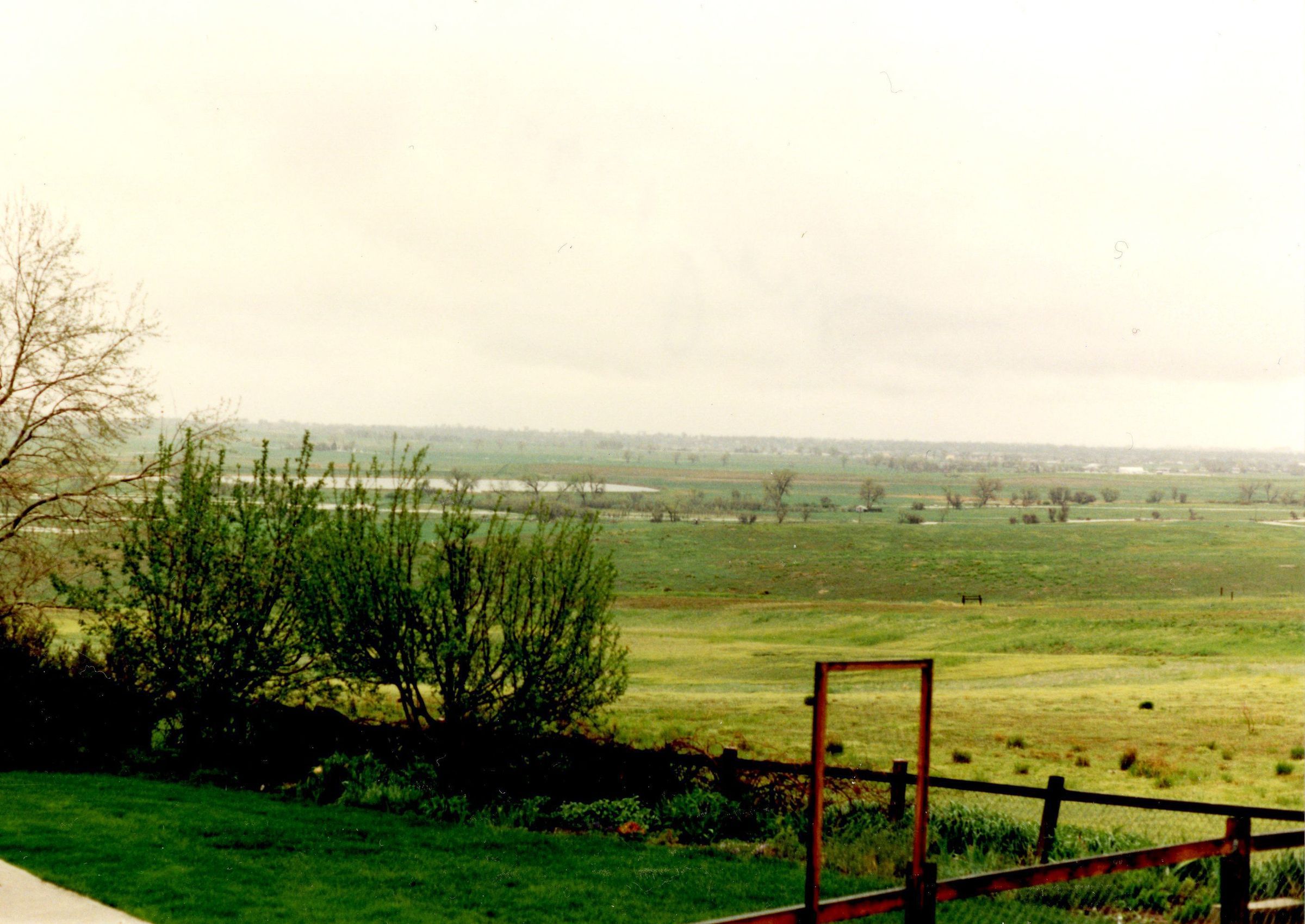 Color photograph showing the view from a yard in the Lac Amora Neighborhood of Broomfield, CO. Photograph was likely taken on a cloudy day.