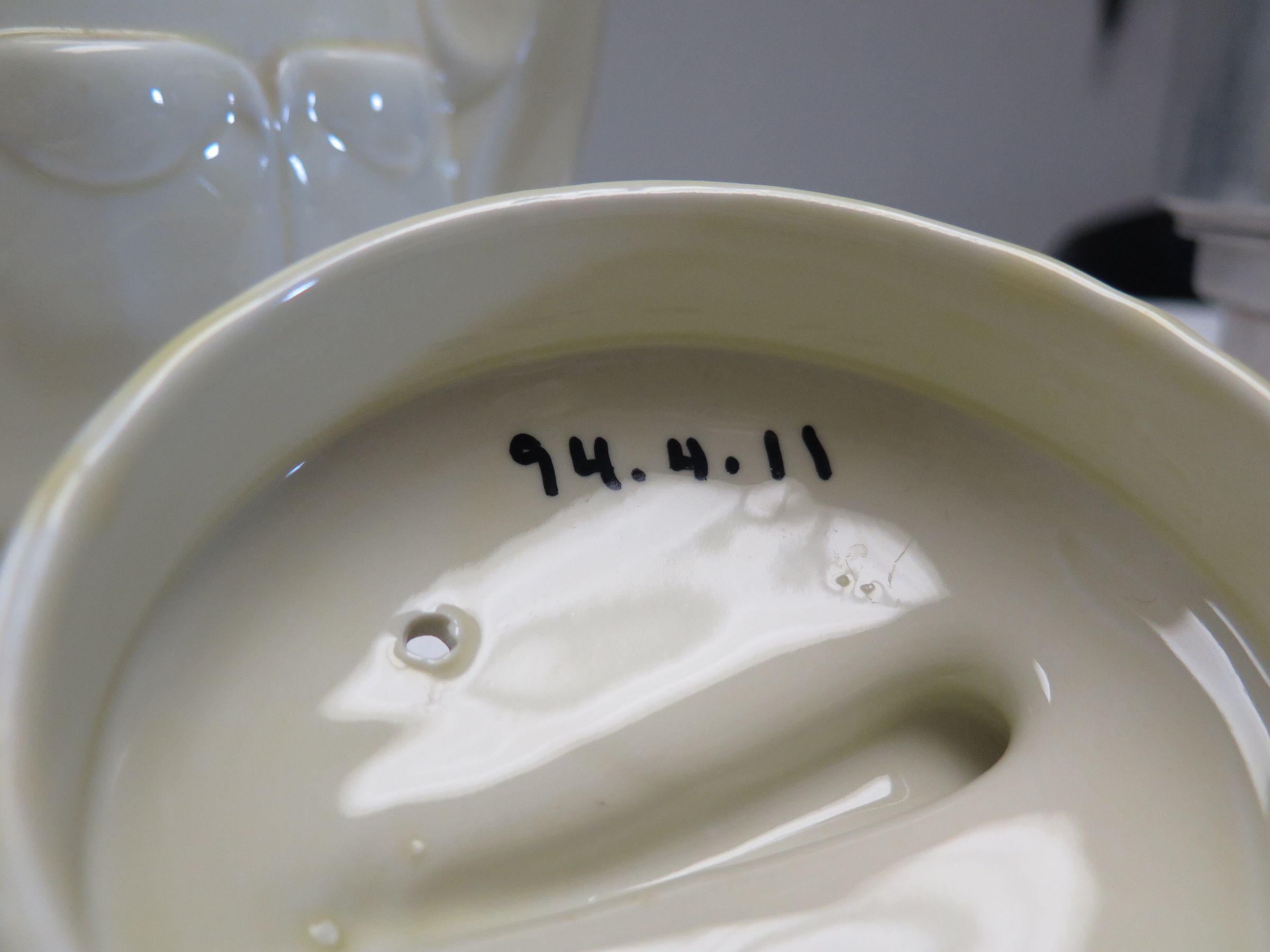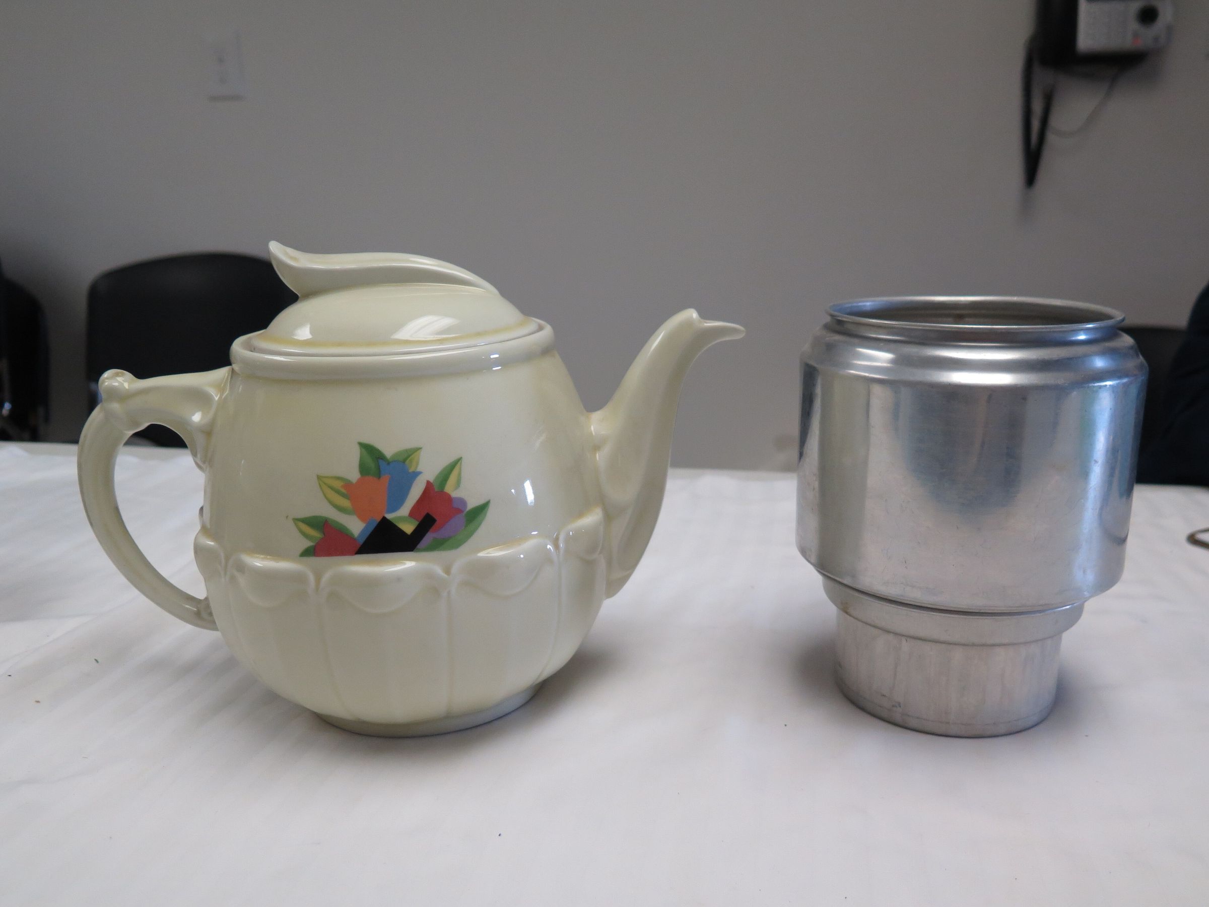 This is a white coffeepot with a lid and a silver metal strainer. The coffeepot has a handle and a spout like a teapot. The coffeepot measures 8.5" (h) x 15" (w) x 7" (l). White ceramic with tulip design. A "Drip-O'Lator" made by The Enterprise Aluminum Co. in Massillon, Ohio.