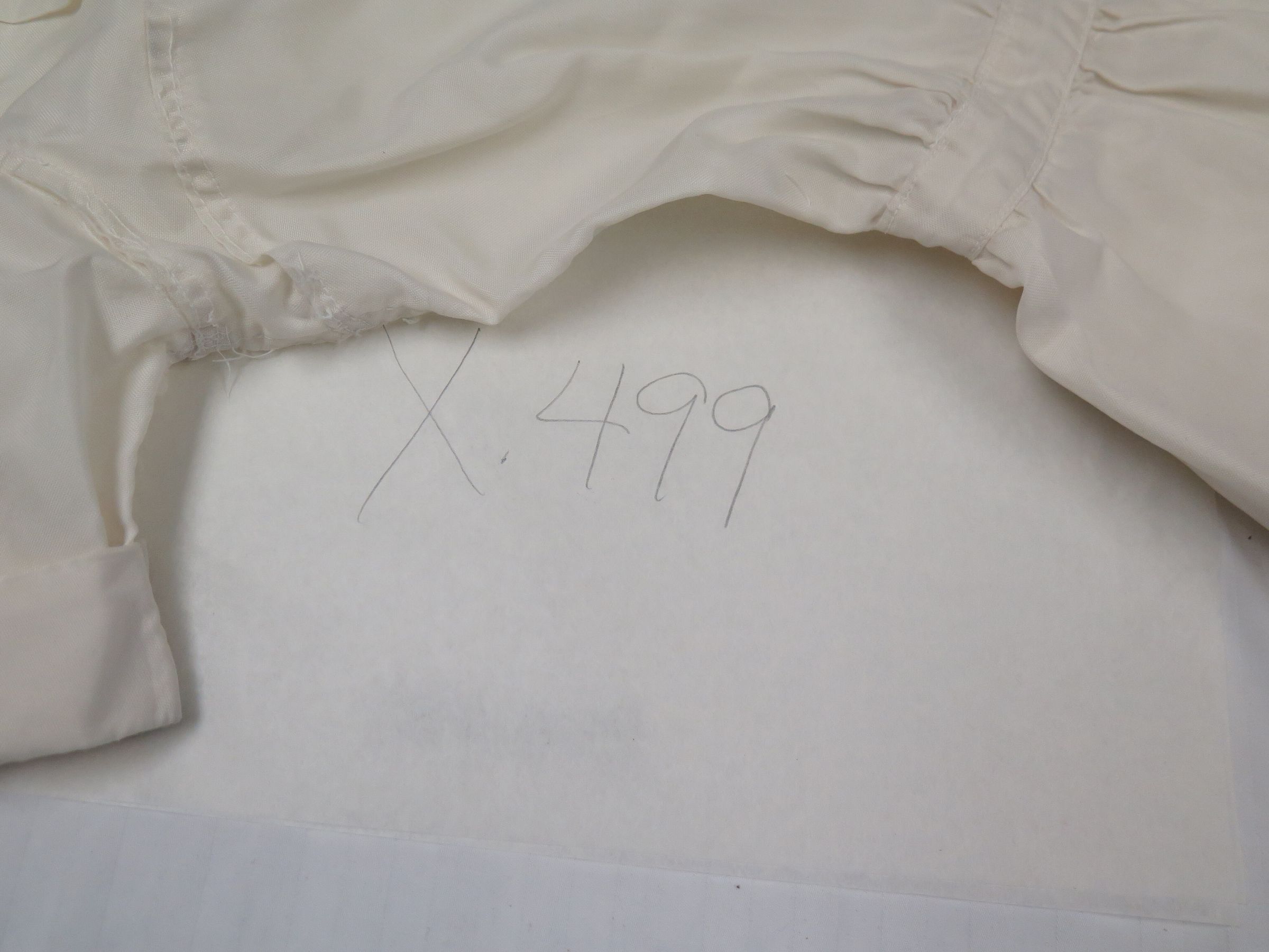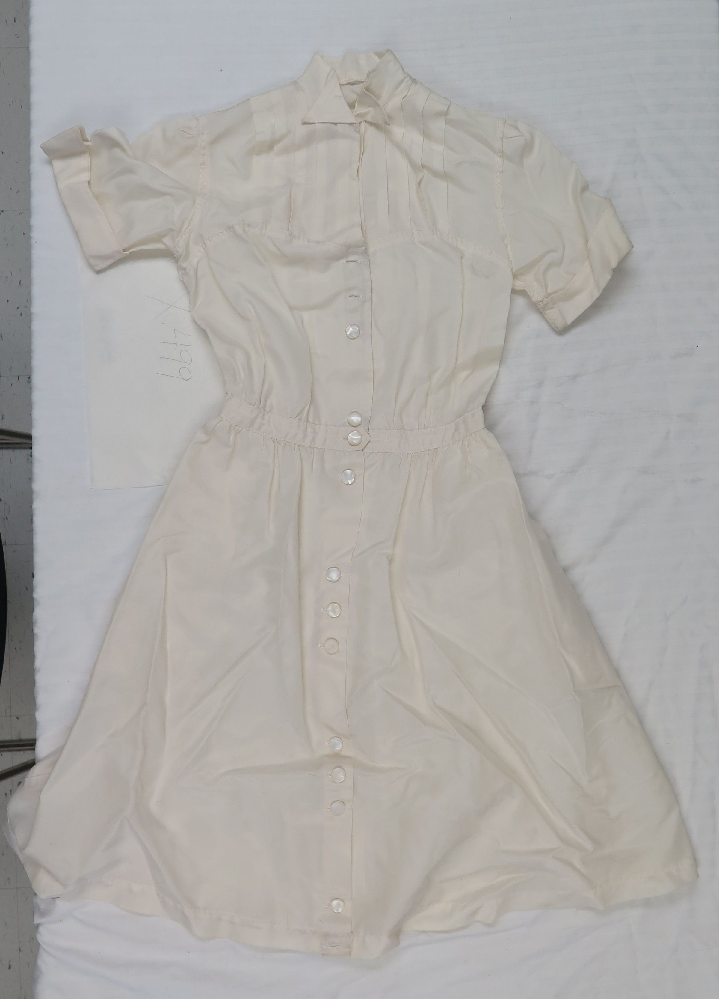 White nurse's/maid's uniform or woman's dress. It is a button up dress with a neck collar. There appears to be an elastic sinch at the waistline. The dress measures 12.5" (w) x 38" (l).